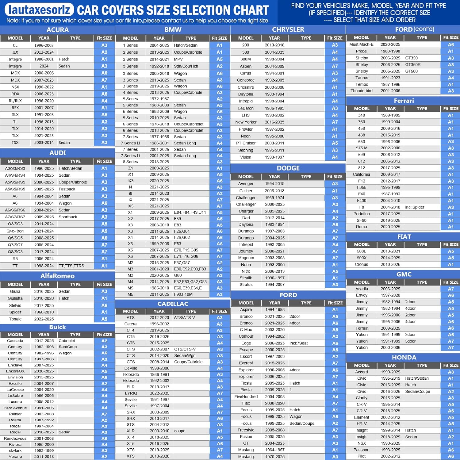 Choose the Right Size: Find your vehicle model and the fit cover size in the size chart (See the Size Chart in images 3 to 5). Please measure size before purchasing.