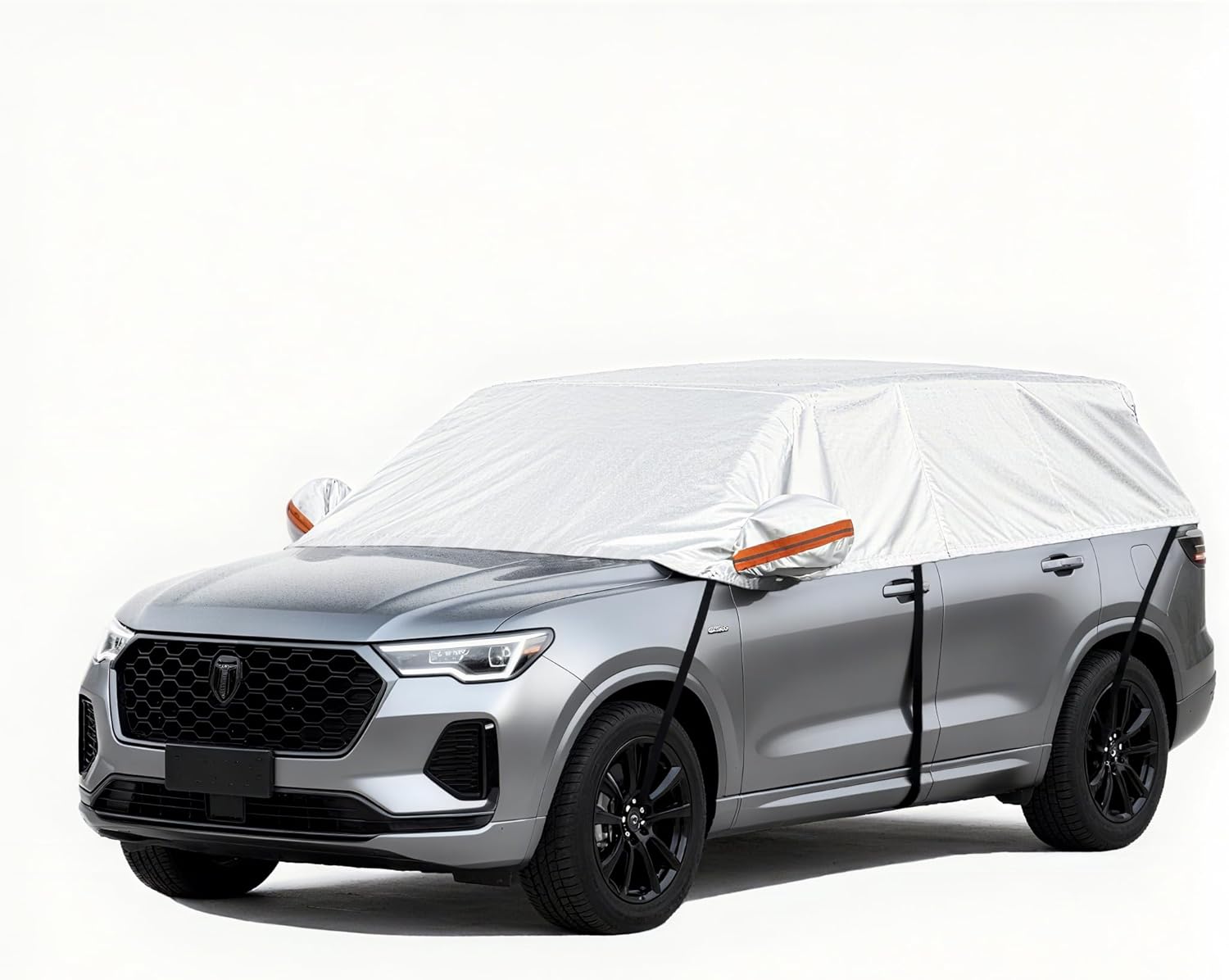 【Universal Fit for Sedans & SUVs】 Designed as a suv half cover and half car cover, this product fits most sedans, SUVs, and hatchbacks. It provides extended coverage for the windshield, roof, and side windows, offering better protection compared to regular car window covers or small windshield covers for snow.vehicle.