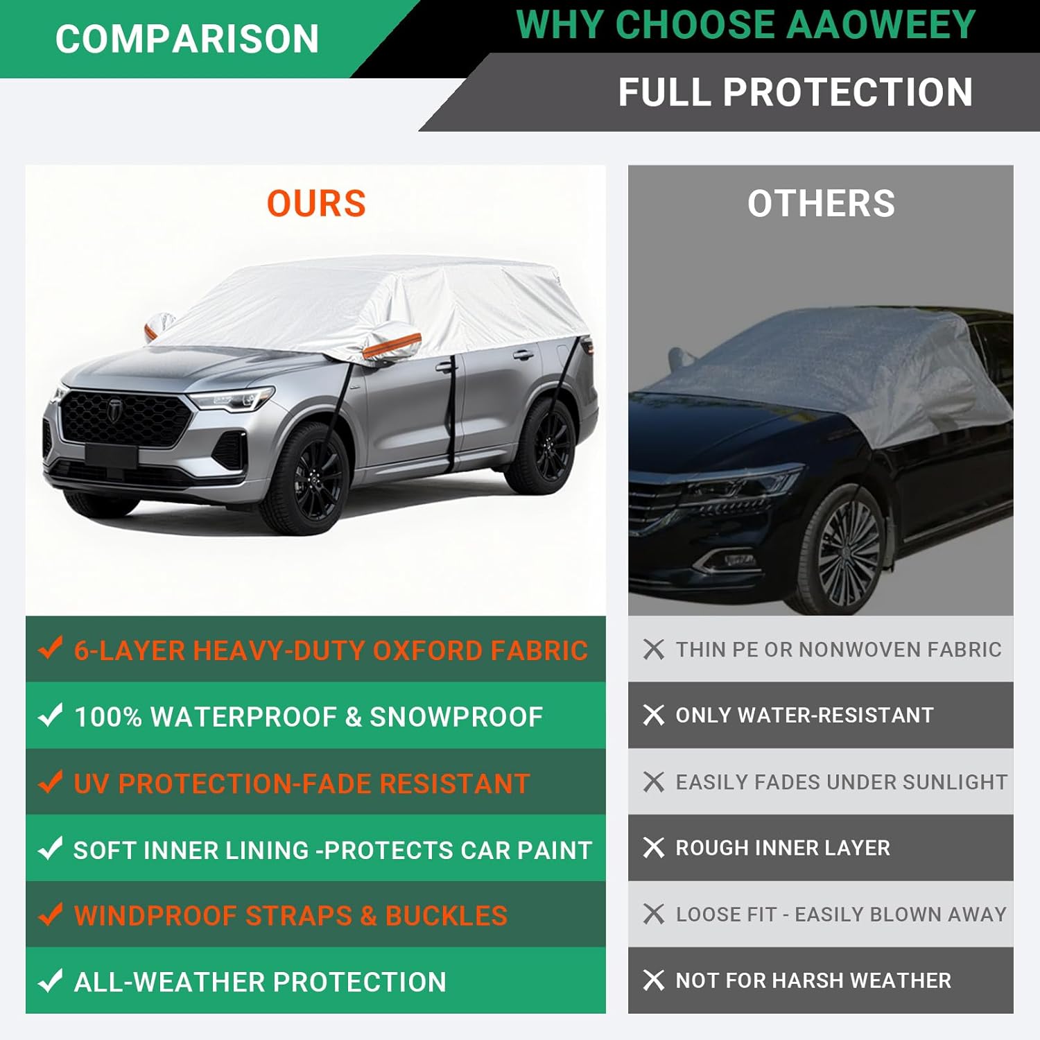 【Upgrade Material】The AAOWEEY half car cover is made of premium composite materials with reflective aluminum, 100% waterproof PEVA, and a soft cotton liner. This heavy-duty car window cover, windshield cover for ice and snow, car snow cover, sunroof cover, and car windshield cover offers 100% waterproof and UV protection, keeping hatchbacks sedans and SUVs safe in all weather.