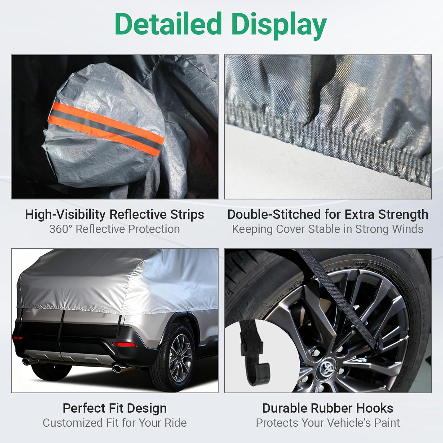 【Windproof & Secure Fit】Equipped with strong elastic straps and durable rubber hooks, this car snow cover stays firmly attached even in strong winds. The design includes reflective strips for safety at night and a snug fit around side mirrors, ensuring the car window cover and windshield cover stay in place.