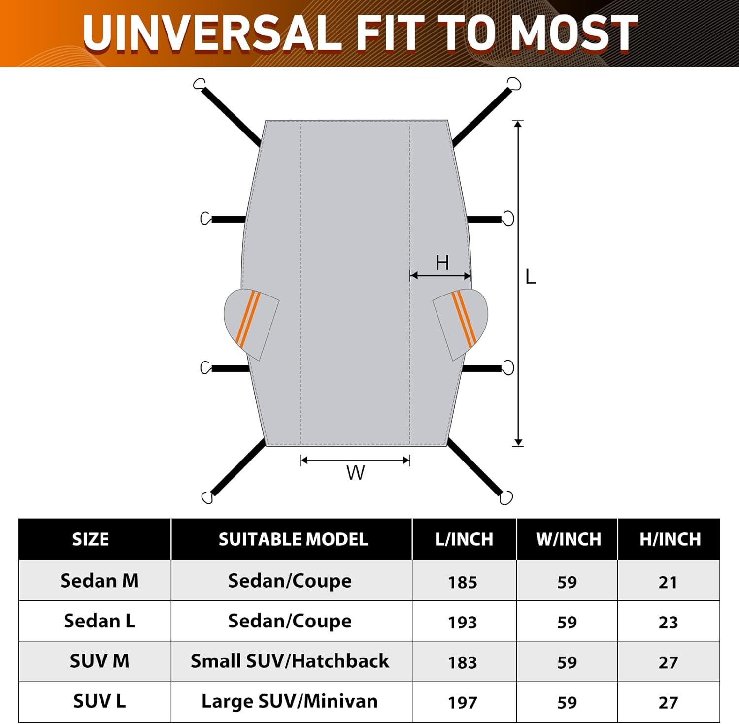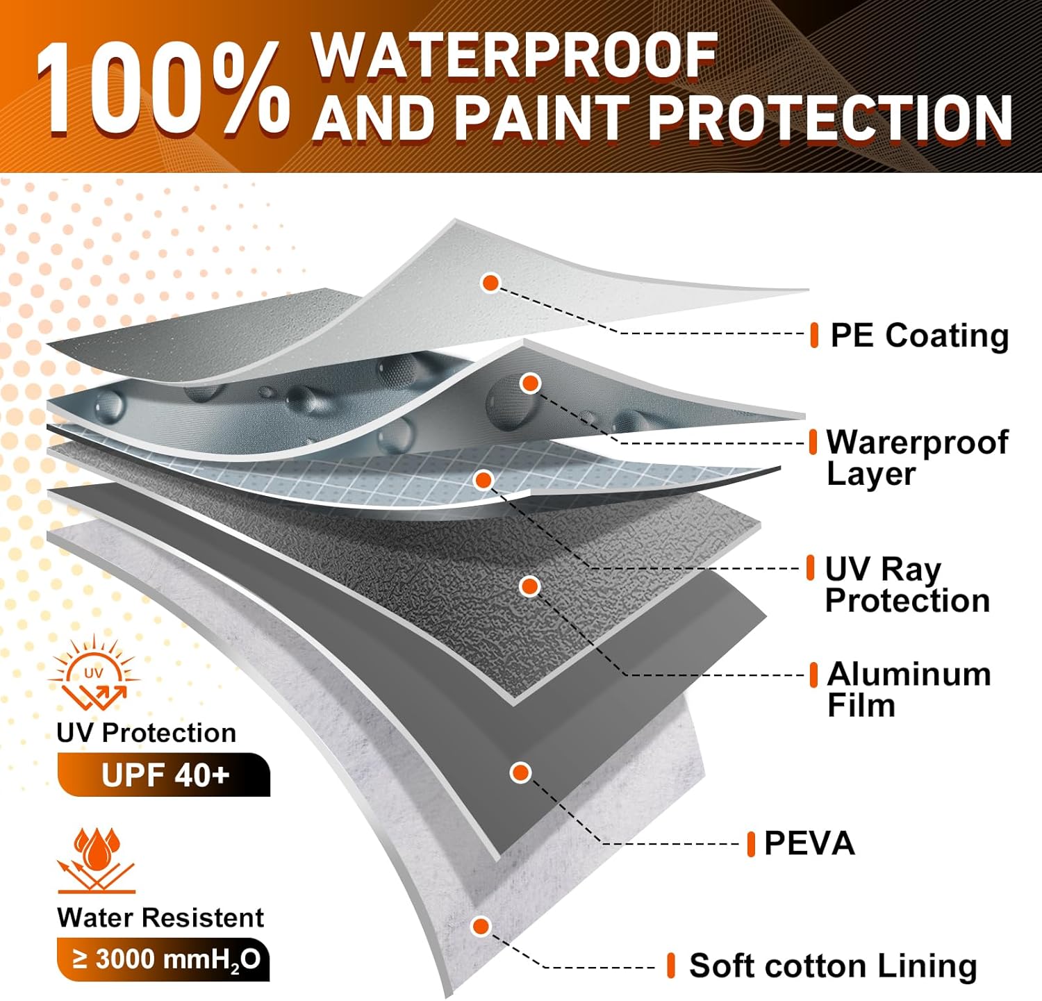 【Durable Waterproof Fabric with Paint-Safe Lining】Built with a high-strength, waterproof, and scratch-resistant outer shell that stands up to daily outdoor exposure. Inside, a soft cotton lining gently contacts your paint and glass, preventing scuffs and swirl marks while adding an extra layer of protection where it matters most