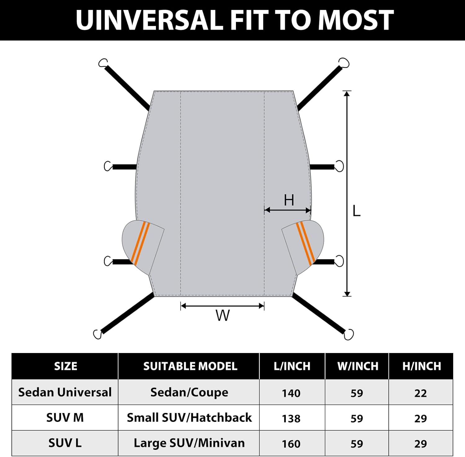 Universal Fit for Most Vehicles: Designed to fit most standard-sized cars, sedans, and SUVs. Refer to our size chart for precise measurements to ensure a snug and secure fit. Note: Not suitable for use under strong wind conditions.