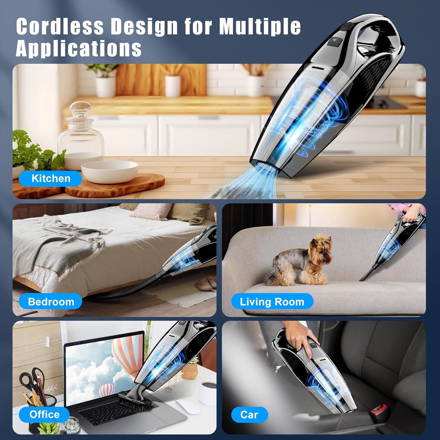 Powerful Suction Handheld Vacuum Cleaner — The handheld vacuum cordless has 7500Pa suction power to help you deal with a variety of dirt. The vacuum cleaner for home is equipped with a washable and reusable a metal filter and two HEPA filters, capable of filtering 99.99% of dust, making it easy to clean dust, debris, pet hair, and food residue and more.