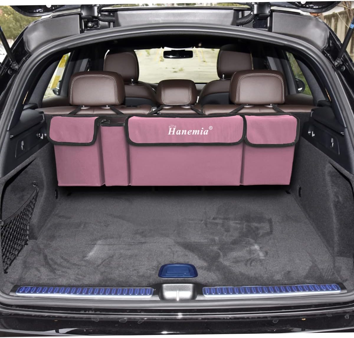 Hanemia Car Trunk Organizer, Backseat Hanging Storage with 4 Large Pockets, Collapsible Cargo Bag with Adjustable Straps Frees Trunk Floor, Sturdy Space Saving Expert for SUV, Truck, Van (Pink)