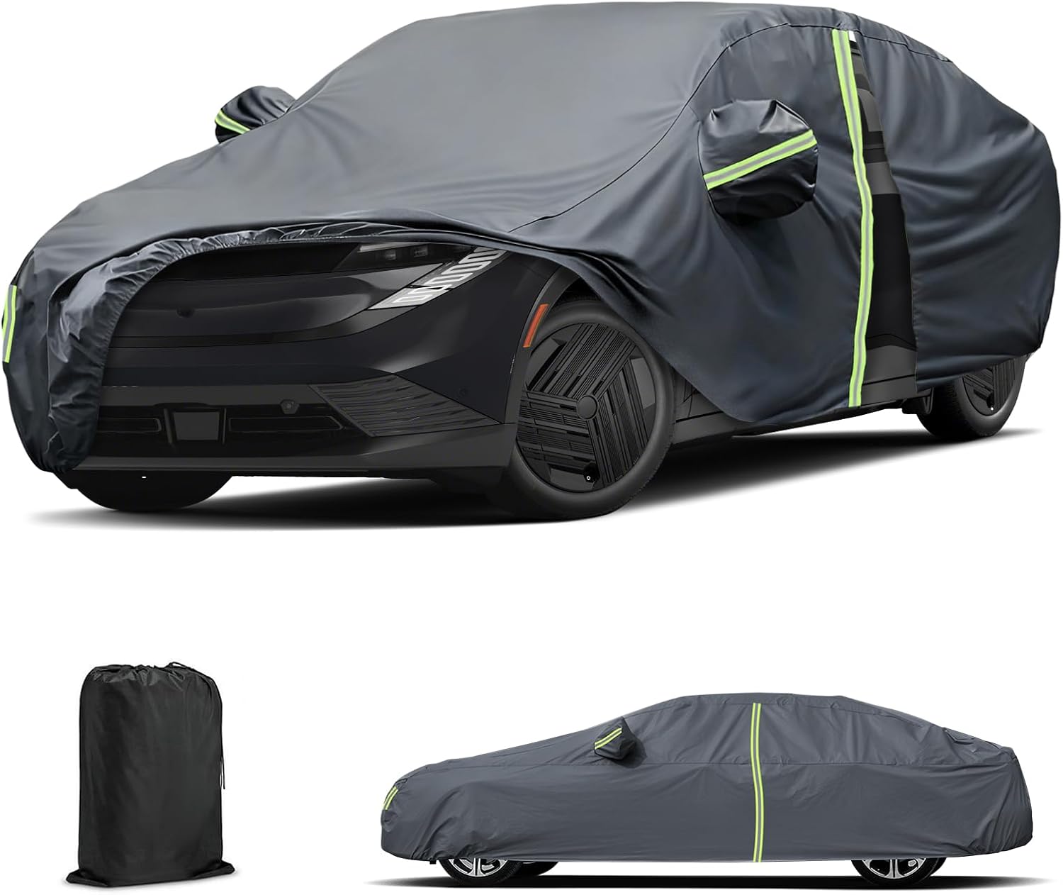 Multifunctional Design: 1. Driver’s door with zipper design for easy entry. 2. Elastic hem at the bottom makes the car cover fit the body better. 3. 7 Reflective strips to remind others at night, avoid accident in dark environment. 4. 4 tire webbing straps and the car bottom webbing straps, helps to secure car cover and prevent it from being blown away by strong winds. 5.Mirror pocket to protect your side mirrors and help you install car cover more easily