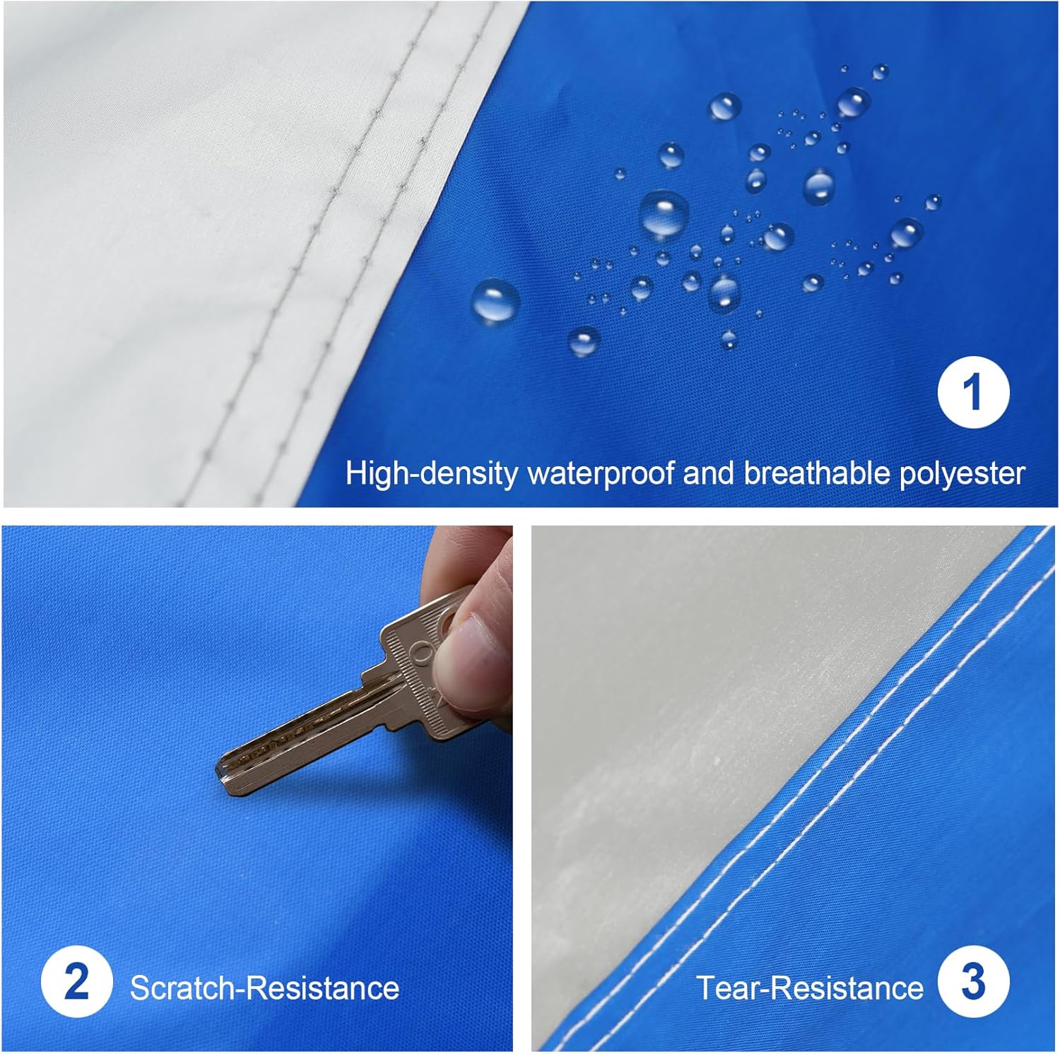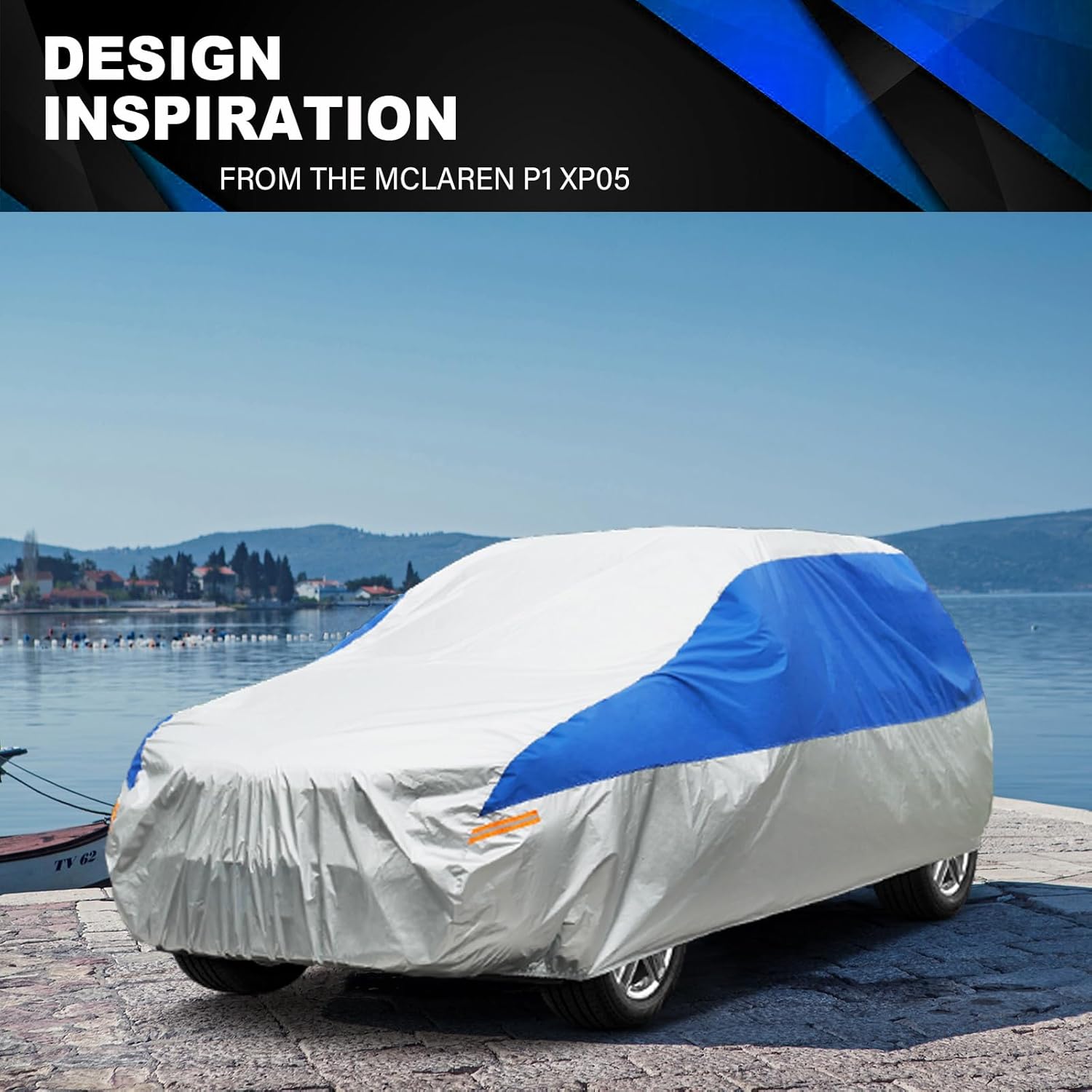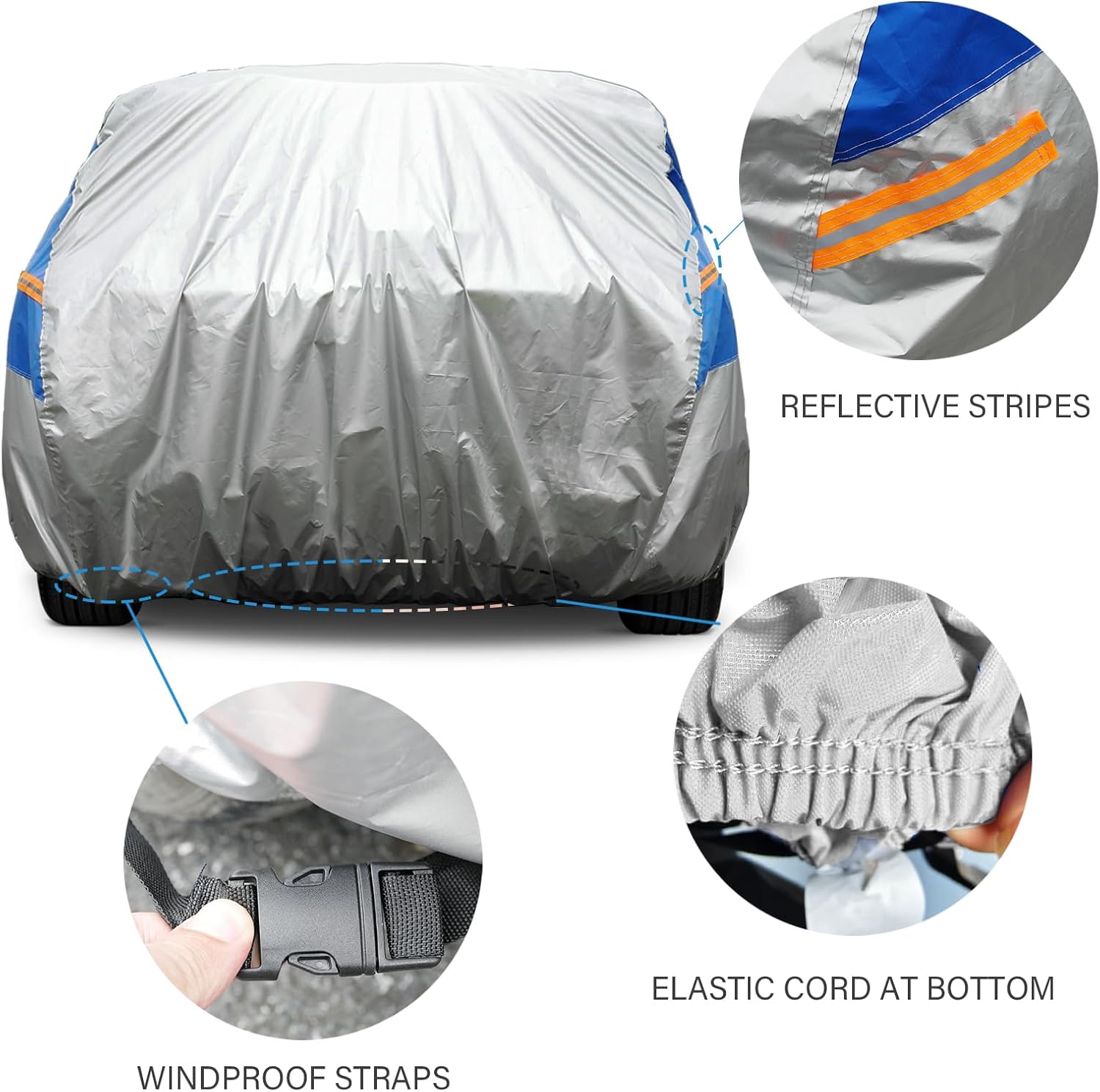 【Unique design】1. 4pcs reflective stripes remind other people in the night, avoid accident in dark environment 2. The elastic hem at the bottom makes the car cover fit the car better 3. Windproof straps can prevent the cover from being blown away by the heavy wind 4. Double stitch technology, it make the fabric stitched tighter, more durable than most similar covers.