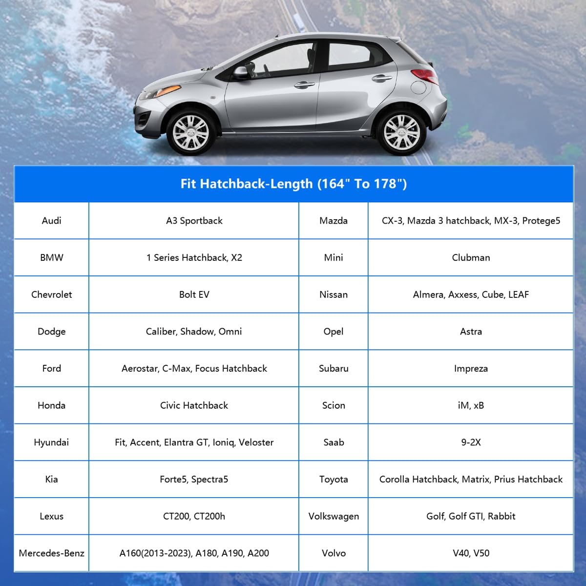 【Choose the Right Model】 Suitable for Hatchback, Length 164 to 178 inch. (Not for Sedan SUV). For example Fit Hatchback–Honda Civic Hatchback, Ford Focus Hatchback, Subaru Impreza Hatchback, Chrysler PT Cruiser, Volkswagen Golf, Ford Fiesta, Chevrolet HHR, Hyundai Veloster/Kona, Nissan Leaf, Fiat 500X/500L, Kia Forte5/Soul, Mini Clubman/Countryman, Toyota Corolla Hatchback, Mazda 3 Hatchback etc.