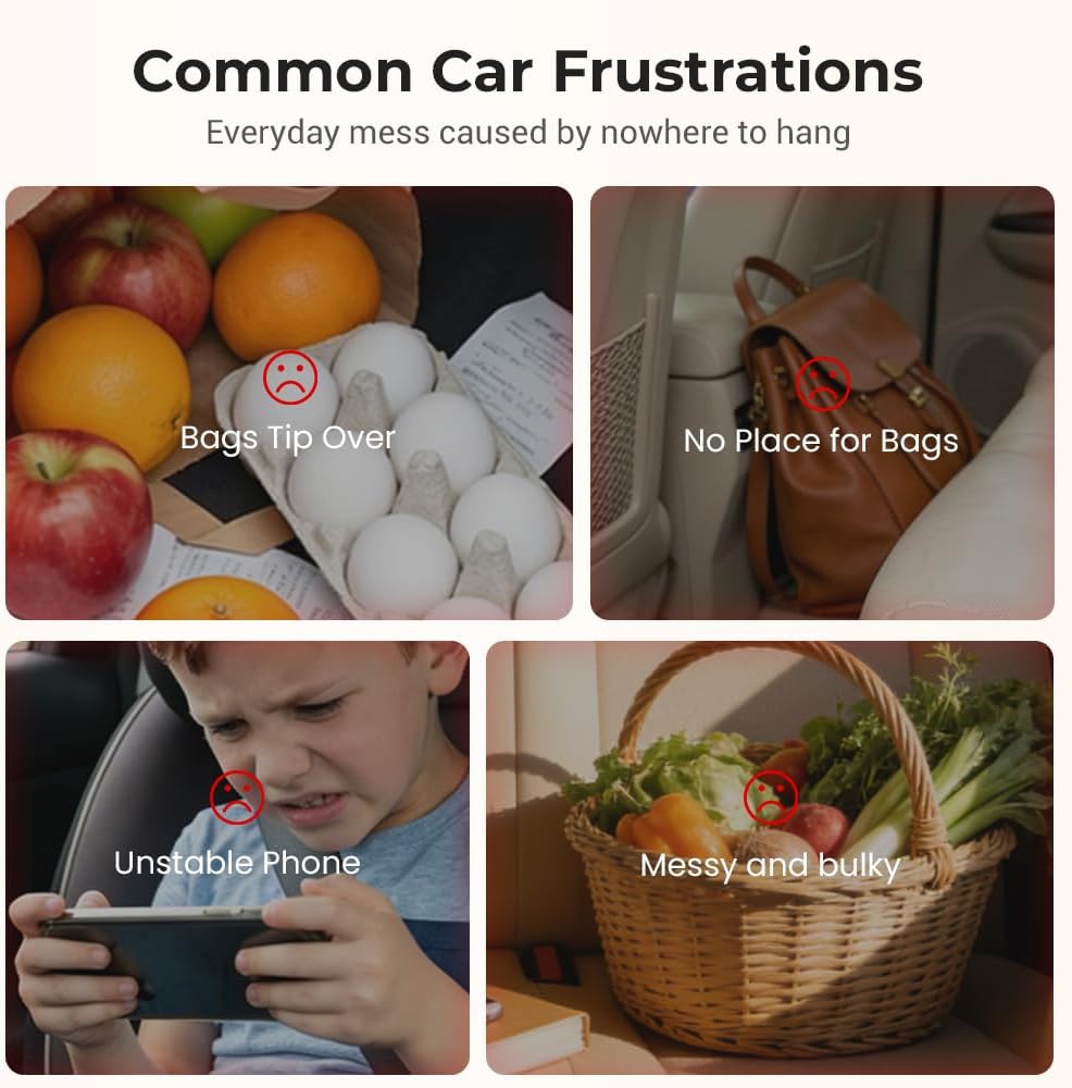 Versatile Headrest Hooks for Car: Our headrest hooks for car are perfect for organizing your vehicle, allowing you to hang groceries, handbags, purses, schoolbags, umbrellas, and more. Say goodbye to cluttered seats and rolling bags with these efficient car seat back storage hooks