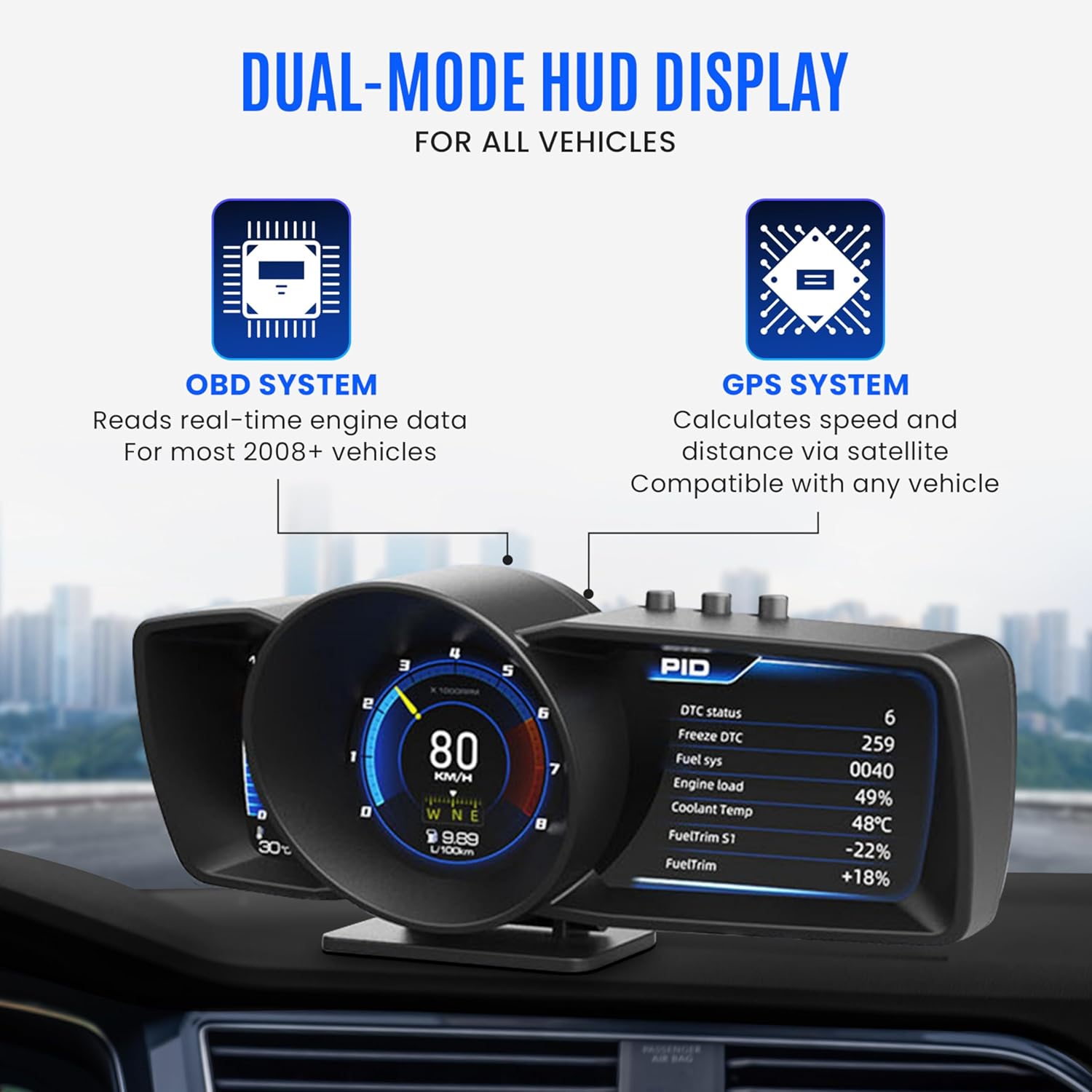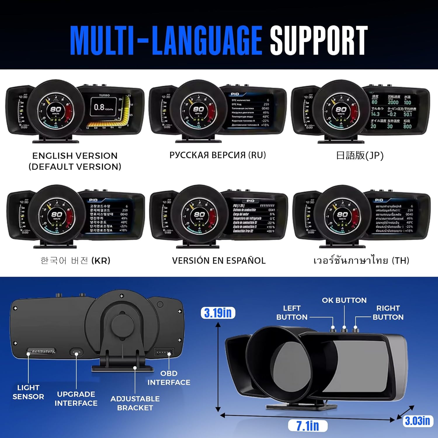 Multi-Language Support & Driver-Friendly Controls: The car speedometer display supports multiple languages including English, Spanish, Russian, Korean, Japanese, and Thai. Physical control buttons allow quick adjustments and menu navigation without relying on touchscreens or removing focus from the road.