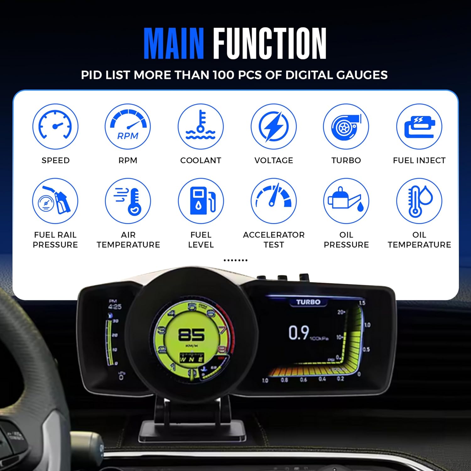 100+ Real-Time Obd2 Digital Gauges: This performant car heads up display shows over 100 live vehicle parameters including digital speedometer, RPM, coolant temperature, oil pressure, voltage, turbo boost, fuel level, air intake temperature, engine load, fuel rail pressure, and exhaust temperature. Ideal for daily driving, performance monitoring, and early issue detection.