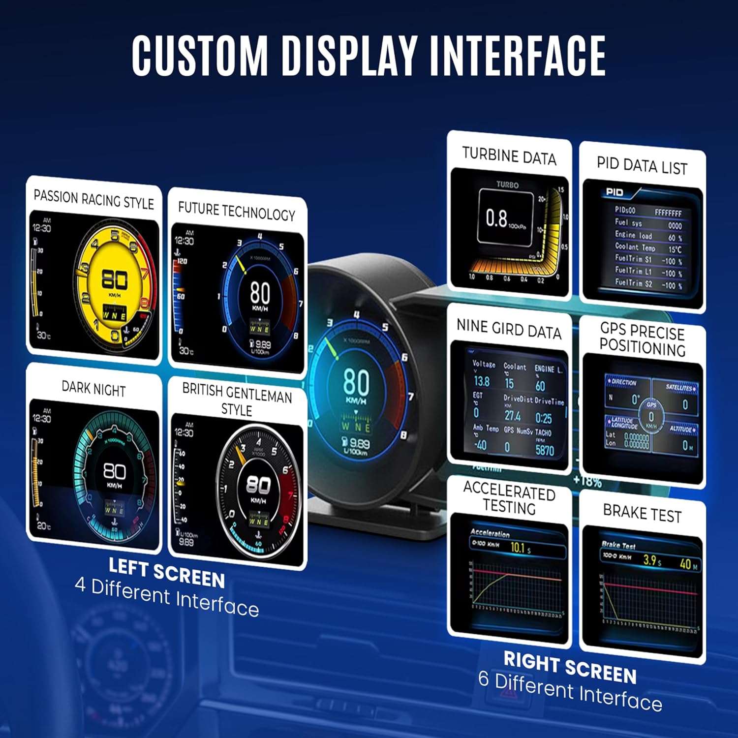 Dual-Screen Smart Display with Custom Interfaces: Our heads up display for cars windshield features a split-screen design with 4 selectable driving themes on the left and 6 advanced data layouts on the right, including PID lists, turbo data, GPS positioning, acceleration testing, and brake testing for a fully personalized driving experience.