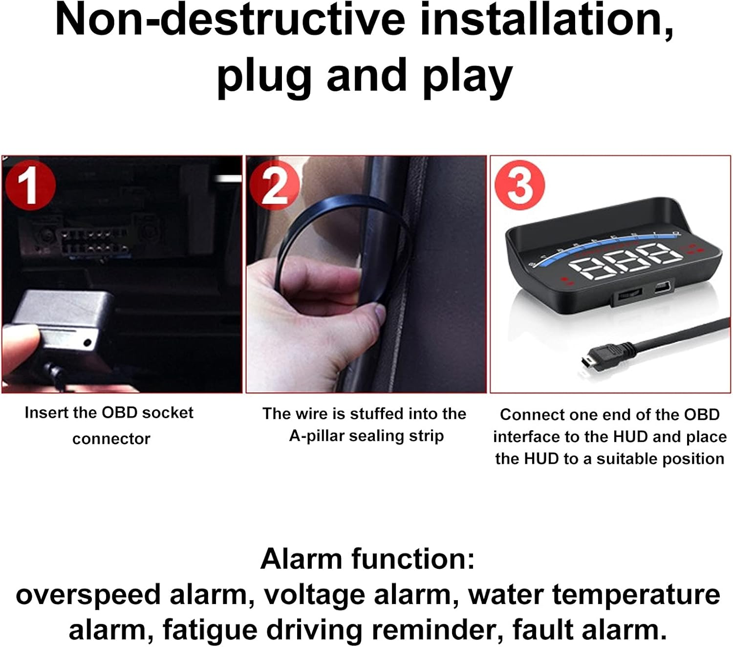 Plug And Play: Heads Up Display for Cars simply connect the head-up display (HUD) with the on-board diagnostic interface (OBD) via the OBD cable, and the head-up display (HUD) will display when the car engine is started. Automatically read car data without damaging the car’s internal equipment.