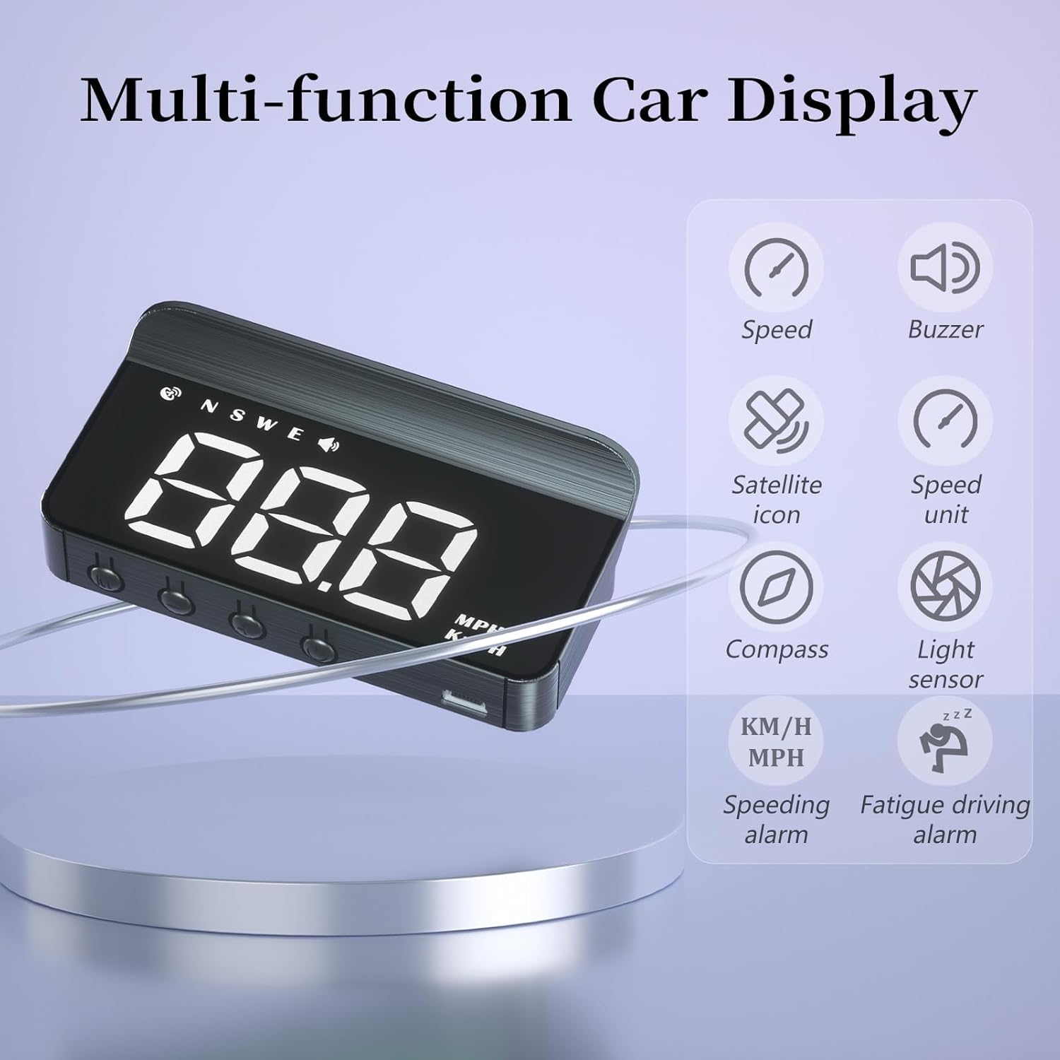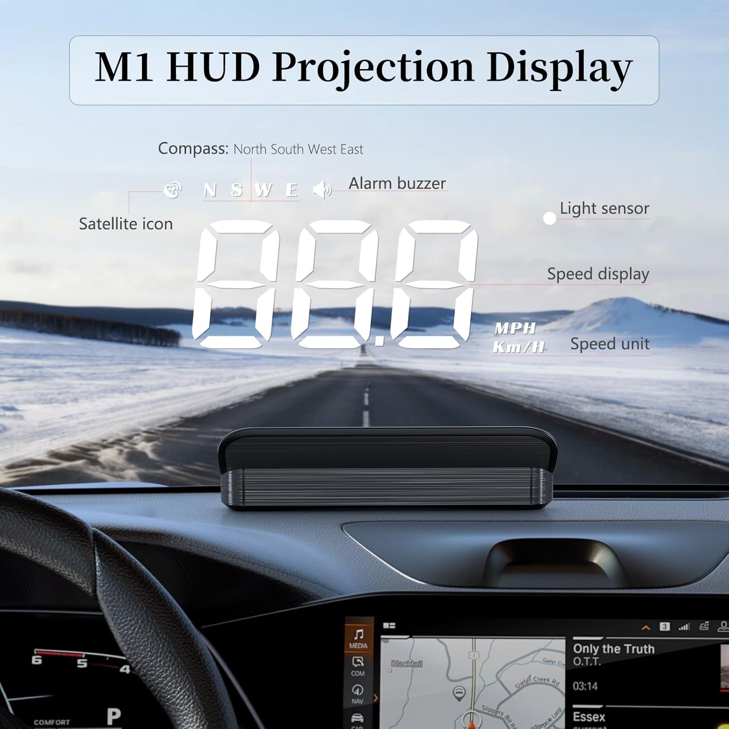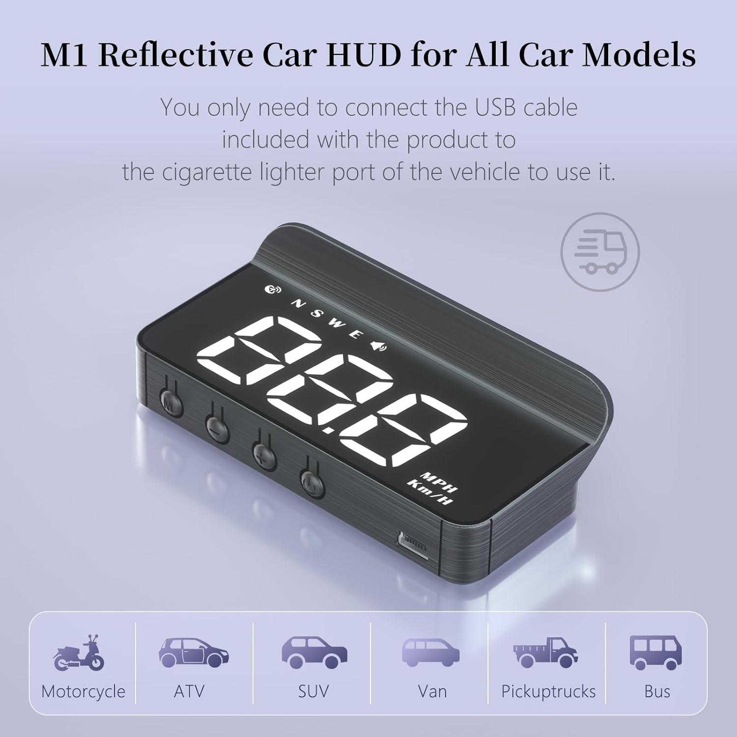 M1 is a new multifunctional head up display that displays vehicle speed, driving direction, overspeed warning, fatigue driving reminder, and automatic light sensing.