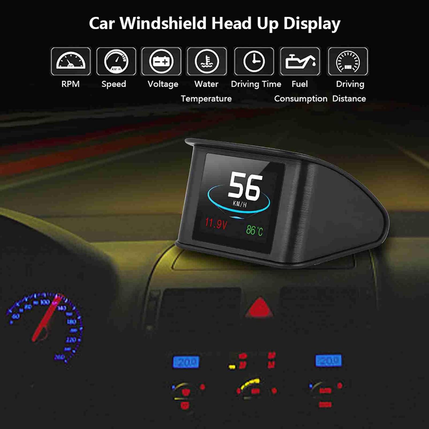 Speed, RPM, water temperature, voltage, instantaneous fuel consumption, average fuel consumption, driving distance measurement, driving time, low voltage alarm, high water temperature alarm, over speed alarm, freely switch between kilometers & miles