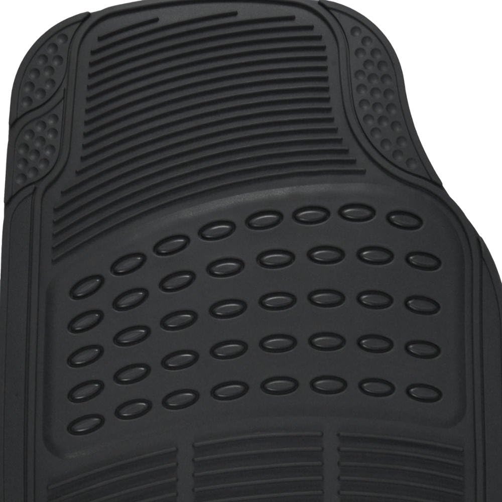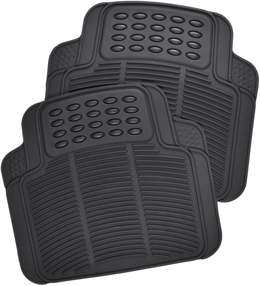 BDK 4-Piece Floor mats protect not only the vehicle’s driver and front passenger floors, but also your rear floor. Made from an original patented material, these rubber mats will hold up to the harsh elements, preventing stains and moisture To the original factory carpets. Easily clean mats with soap and hot or cold water and a mild brush, No harsh scrubbing or special cleaners needed! Special anti-skid nib backing will prevent any slipping or movement on contact. Keep your focus on your driving, and not on adjusting your car Mats! Keep your car floor in pristine condition, easily, from the trusted brand in automotive car accessories, BDK! Measurements: front mats: 27. 5″ X 17″, rear mats: 16. 5″ X 18″