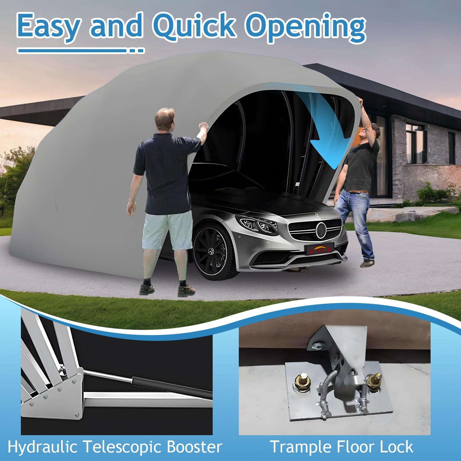Stainless Steel Car Shelter : This foldable carport uses a stainless steel sturdy frame can withstand bad weather such as wind and rain. It can bear up to 300 kg and remain stable on various grounds. You can choose expansion screws to fix the removable carport to the ground, or you can choose to use ropes to fix it and move it at any time