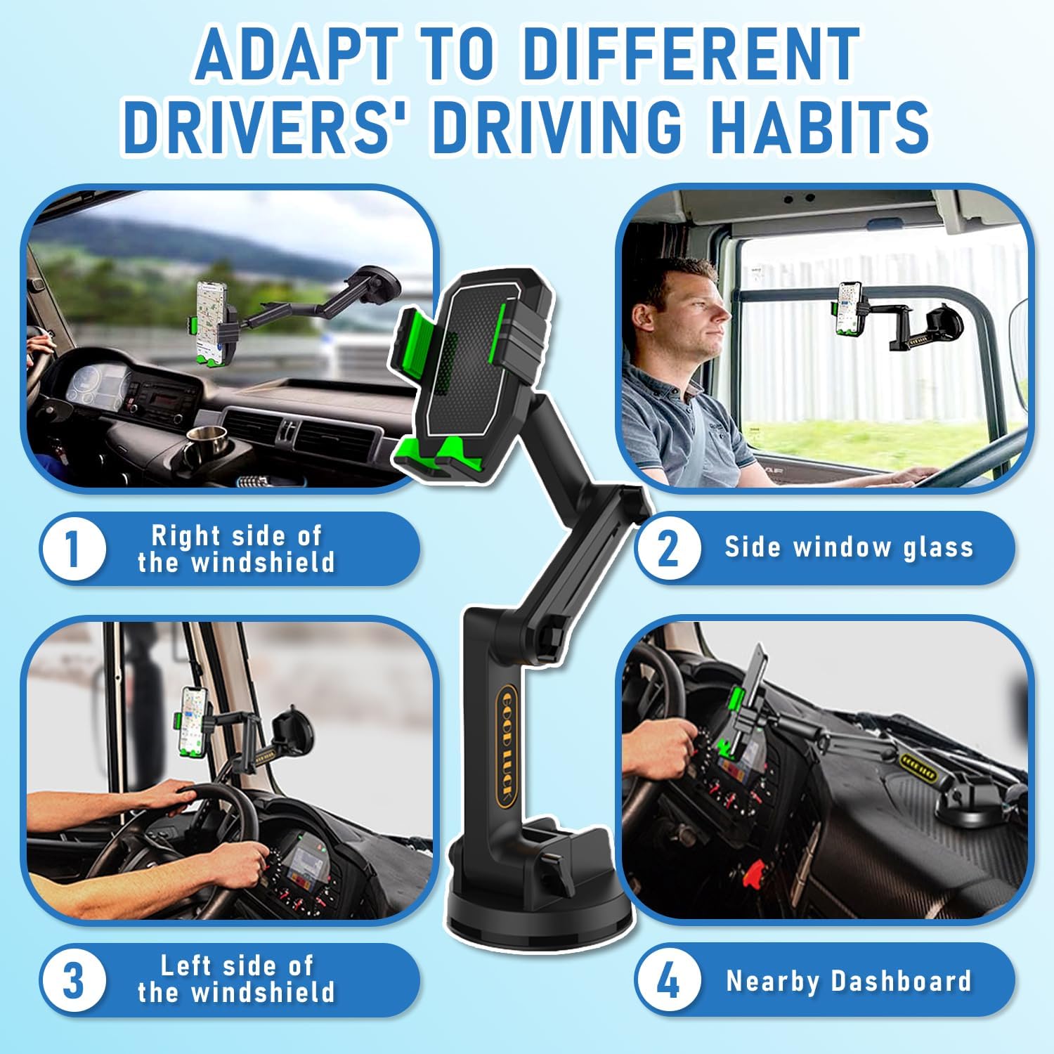 Especially Designed for Trucks:With 16.9 inches long arm, this truck phone mount can use on different surfaces of heavy-duty vehicles, such as bucket trucks, SUVs, Vans, Buses, and heavy-duty trucks, whether you need to use it on the windshield,the dashboard.hether you need to use it on the windshield,the dashboard.