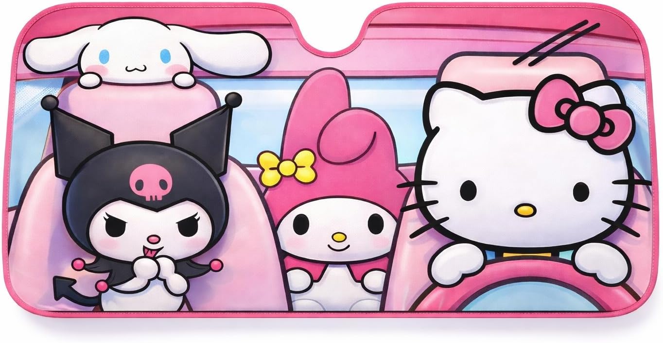 Introducing our adorable Hello Kitty Front Windshield Sunshade, the perfect blend of style and functionality for your car! Say goodbye to scorching hot interiors and harmful UV rays damaging your vehicle’s dashboard, seats, and steering wheel. This officially licensed Hello Kitty sunshade not only keeps your car cool but also adds a delightful touch of cuteness to your daily drive. Hello Kitty Car Sunshade Auto Front Windshield Sunshade Featuring Friends Multicolor 58 x 28in.