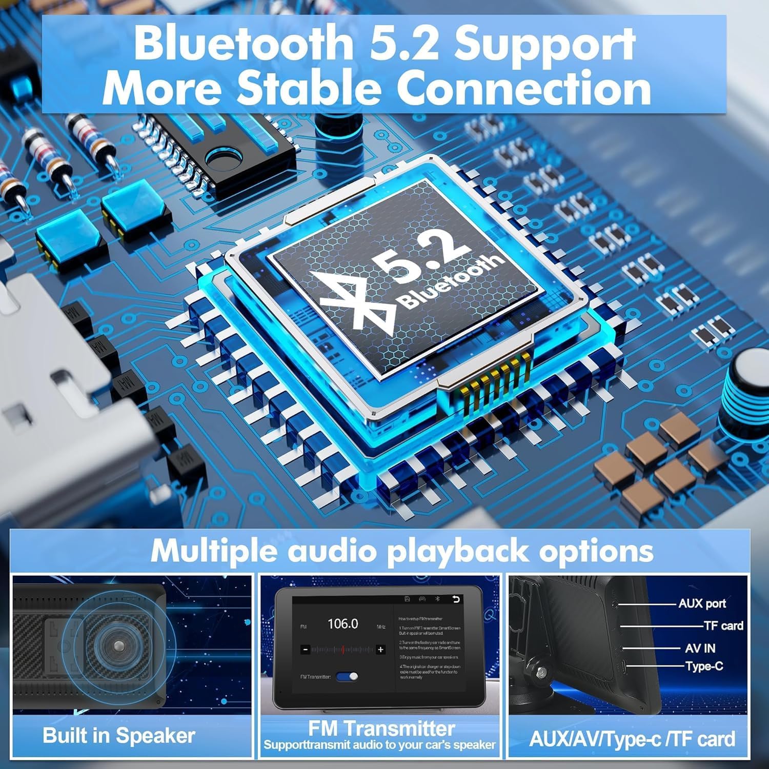 【7 Inch Universal Size & Fits All Vehicles】This 7 inch portable wireless carplay with stereo android auto is suitable for Mercedes Benz, BMW, Audi, Chevrolet, Cadillac, Lexus, Ford, Toyota, Nissan, Buick, Jeep, Hyundai and so on .12-24 Voltage is suitable for most of car types, such as cars, trucks, caravans, vans, trailers, campers, etc. The stereo carplay for older cars or new , all drivers can have a good user experience. The best choice for the cars without factory original screen.