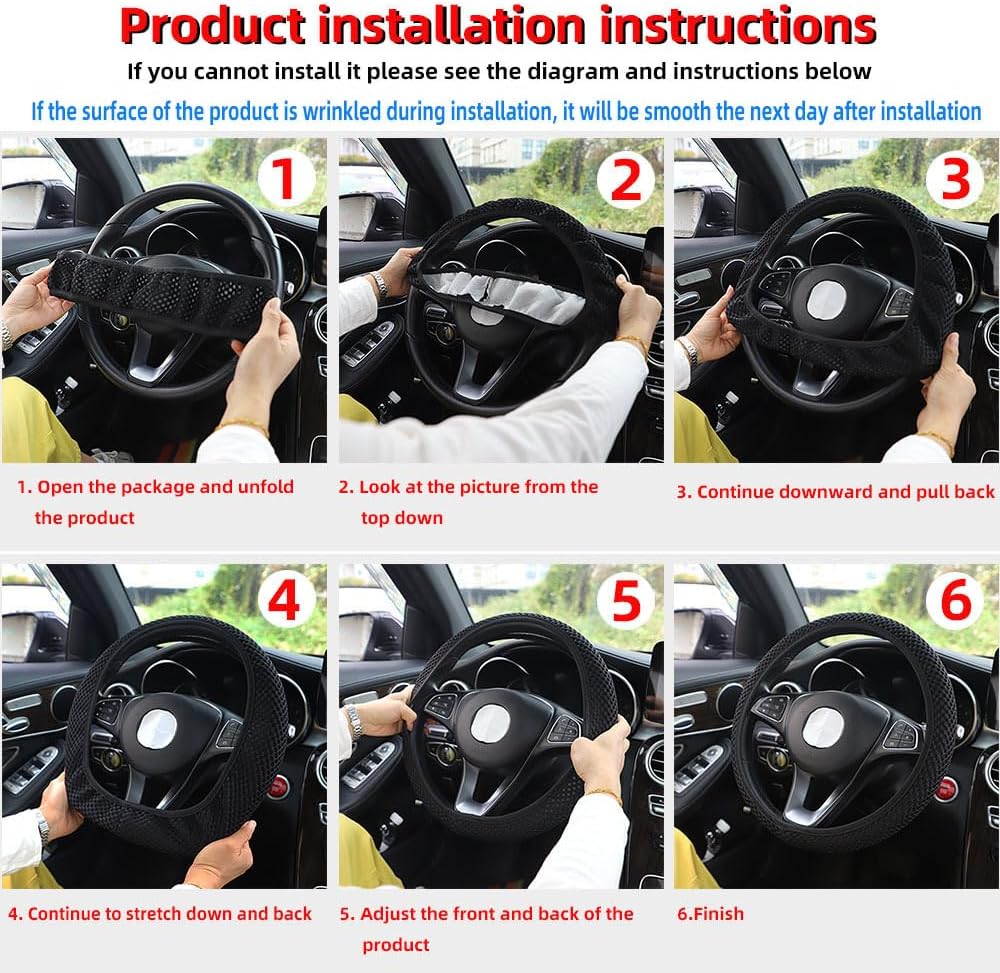 Easy to Install: Because of the ductility material, any adult can easy install this steering wheel cover, no tools required. Place the cover on the top of the steering wheel and use both hands to slowly tighten it on both sides until it fits perfectly with the steering wheel.