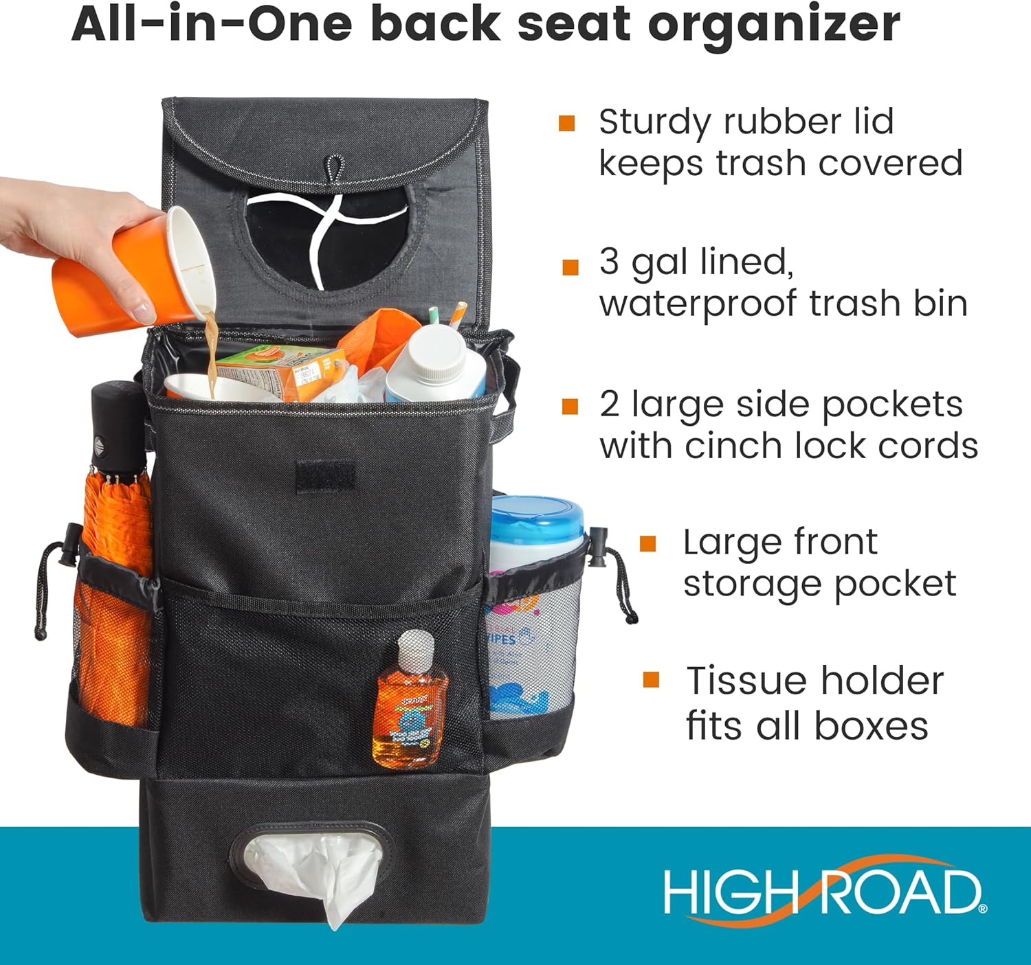 Large Vehicle Trash Can – 3 gallon leakproof car garbage can with lid features High Road’s exclusive StuffTop lid, to keep trash and odors contained, even while filling