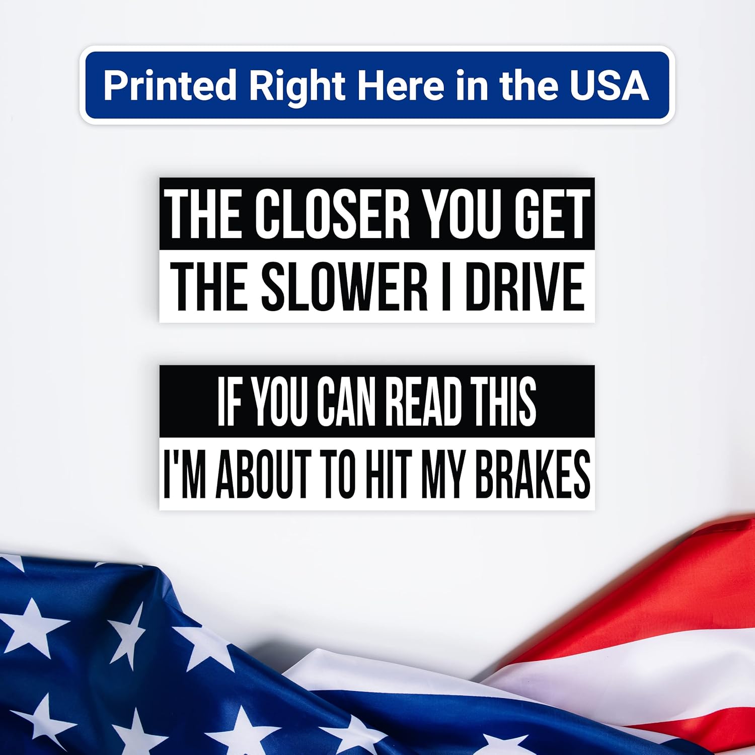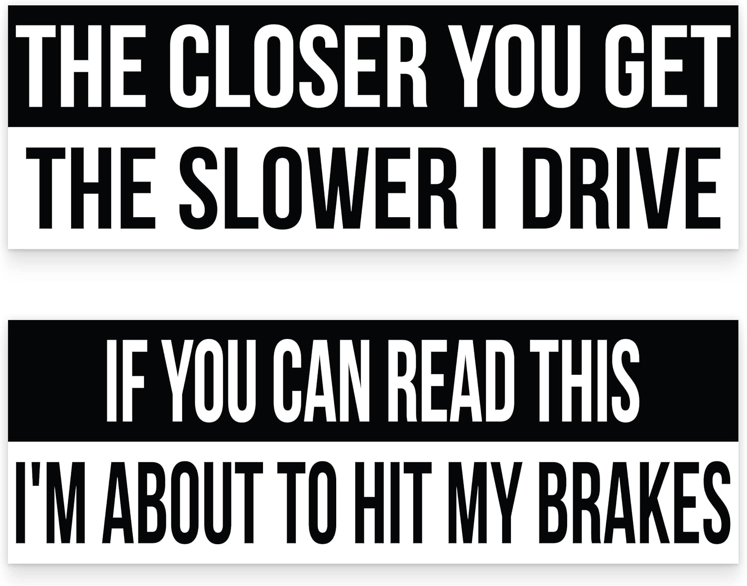 You will receive (1) \ If You Can Read This I’m About To Hit My Brakes\ and (1) \ The Closer You Get The Slower I Drive\ black and white bumper stickers of size 9\ x 3\ each.