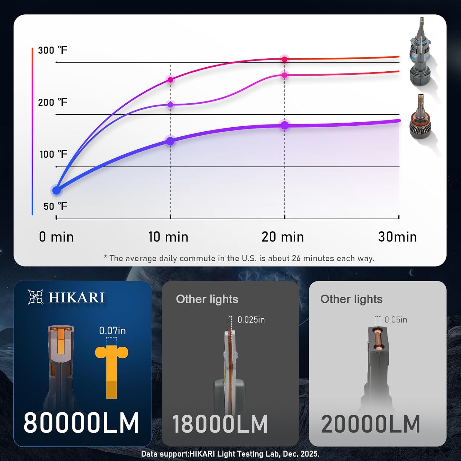 【Pure White & Extended Reach】: HIKARI 2026 Future LED bulbs, featuring the advanced Titanova 7mm*4mm chip, deliver 80,000 lumens of crisp 6000K cool white light, making them suitable for use in rainy, foggy and snowy weather