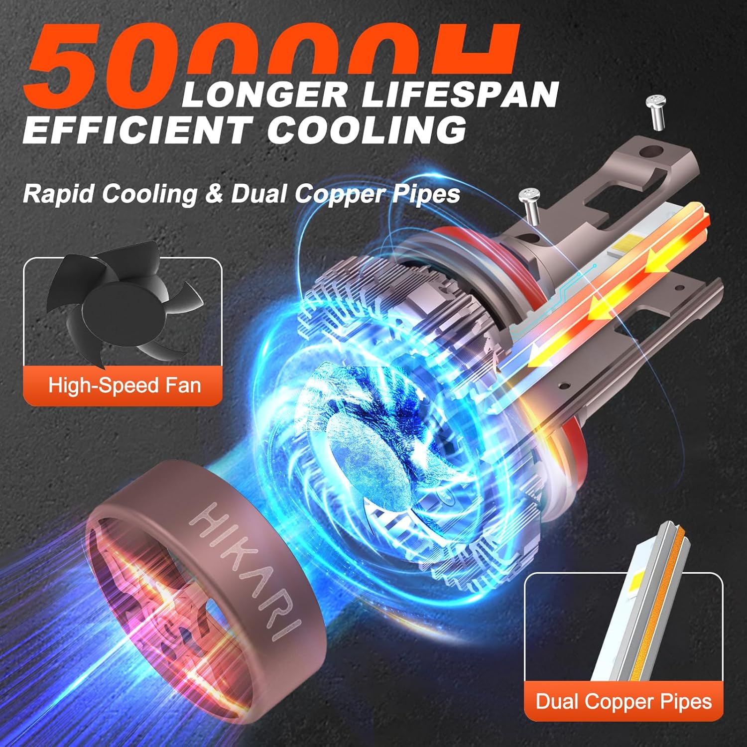【Enhanced Lifespan & Efficient Cooling】: Our lights feature a dual copper tube design, aerospace aluminum construction, and a high-speed fan operating at 15,000 RPM. This reduces surface temperature by 20% to 30%, ensuring stable thermal performance. With an extended lifespan of over 50,000 hours, our lights guarantee reliable operation even in demanding conditions.