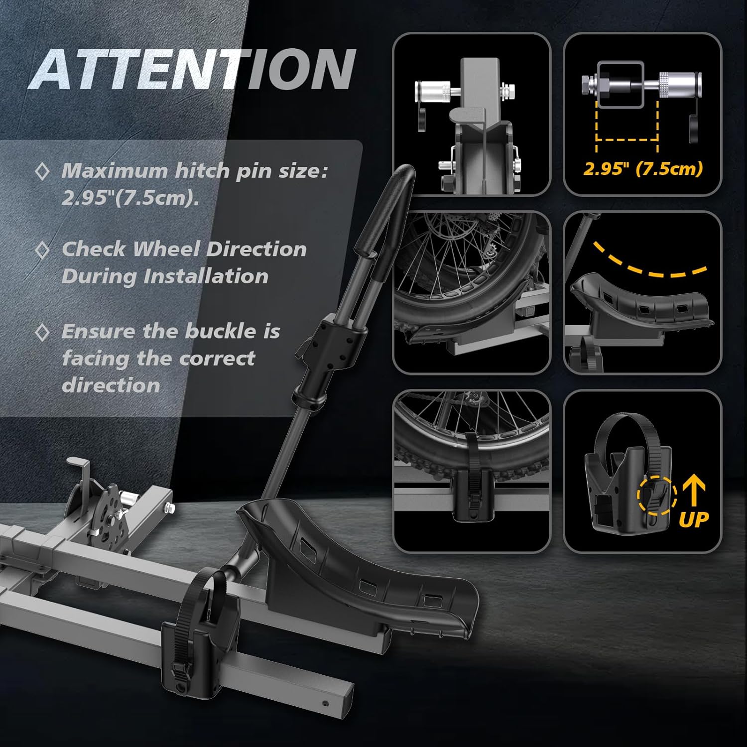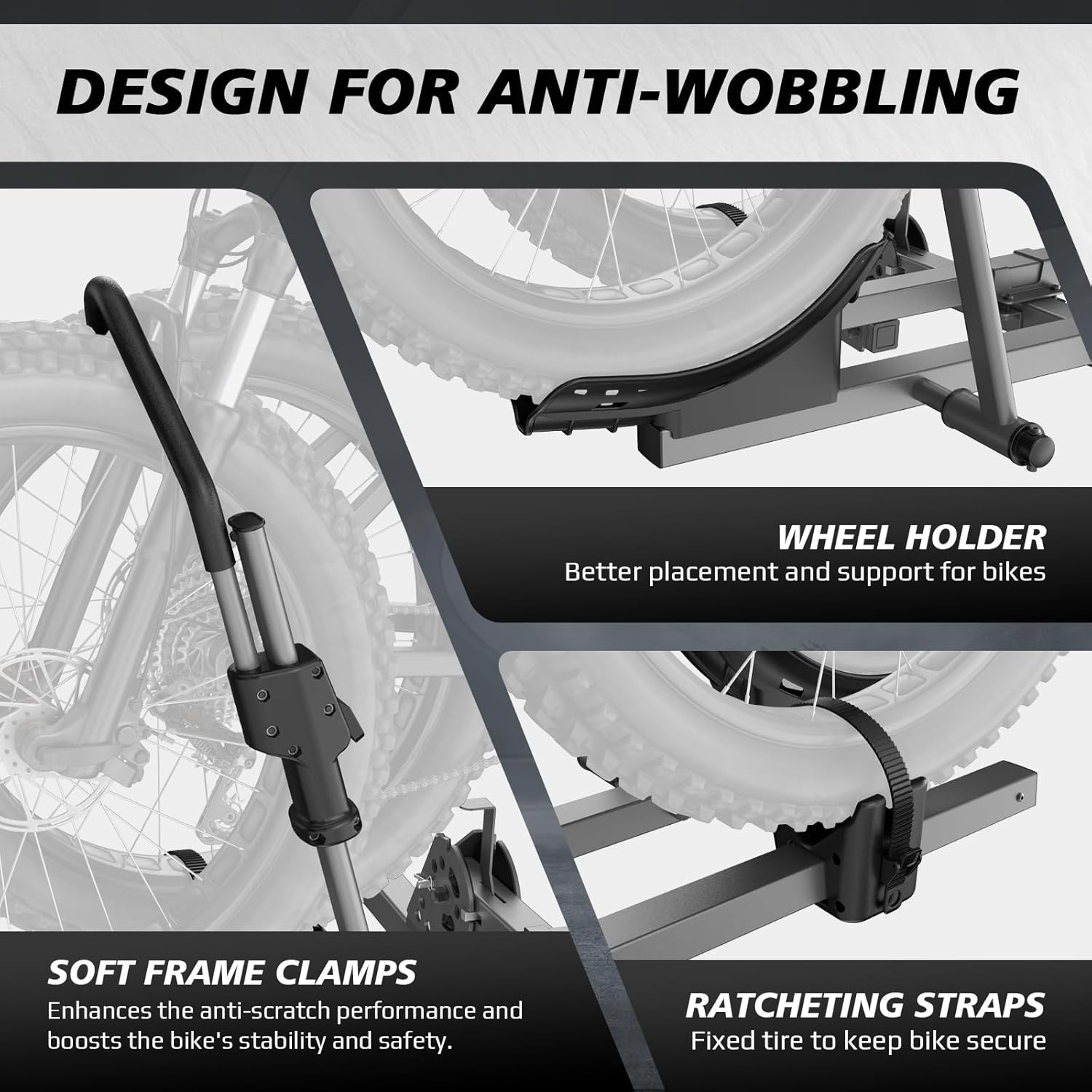 【Multi-layered Safety and Stability Design】:Your bikes won’t be bouncing around or shifting while you drive. With padded clamps to secure the frame, wheel cradles to keep your tires in place, and anti-wobble features to limit movement, this rack ensures your bikes stay safe and steady. Plus, the individual straps keep each bike snug and secure, so you can cruise with confidence, knowing your gear is safe from any bumps or jolts.