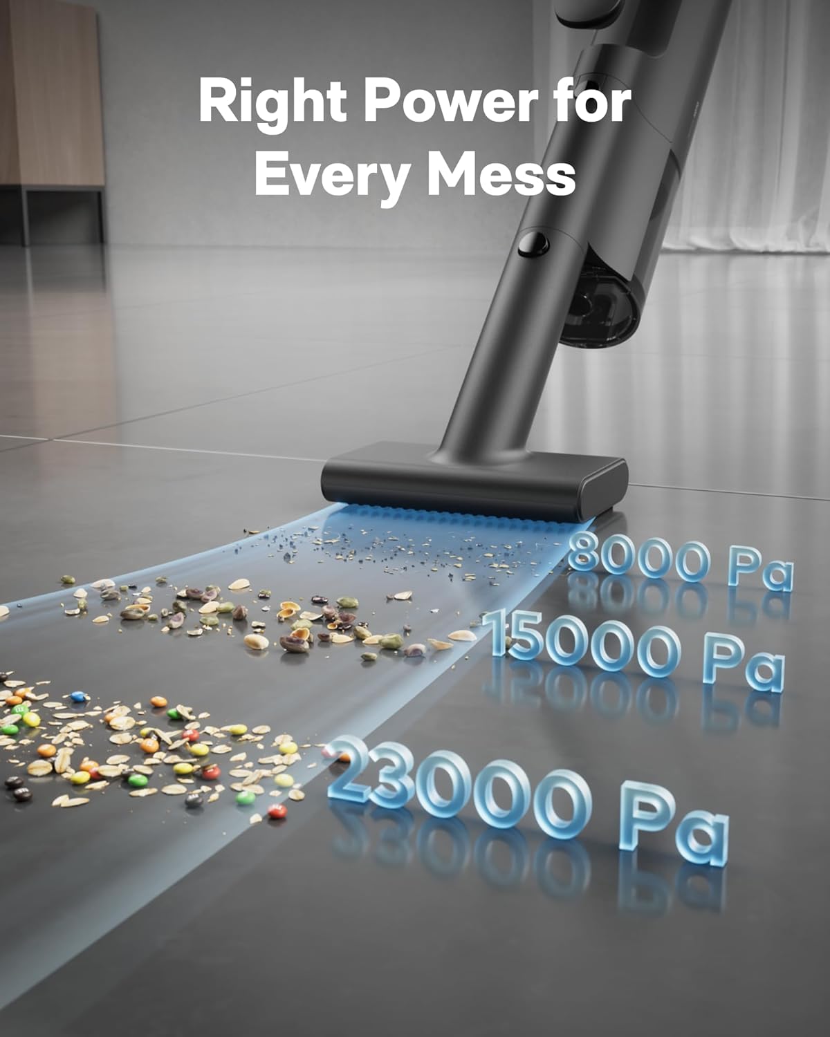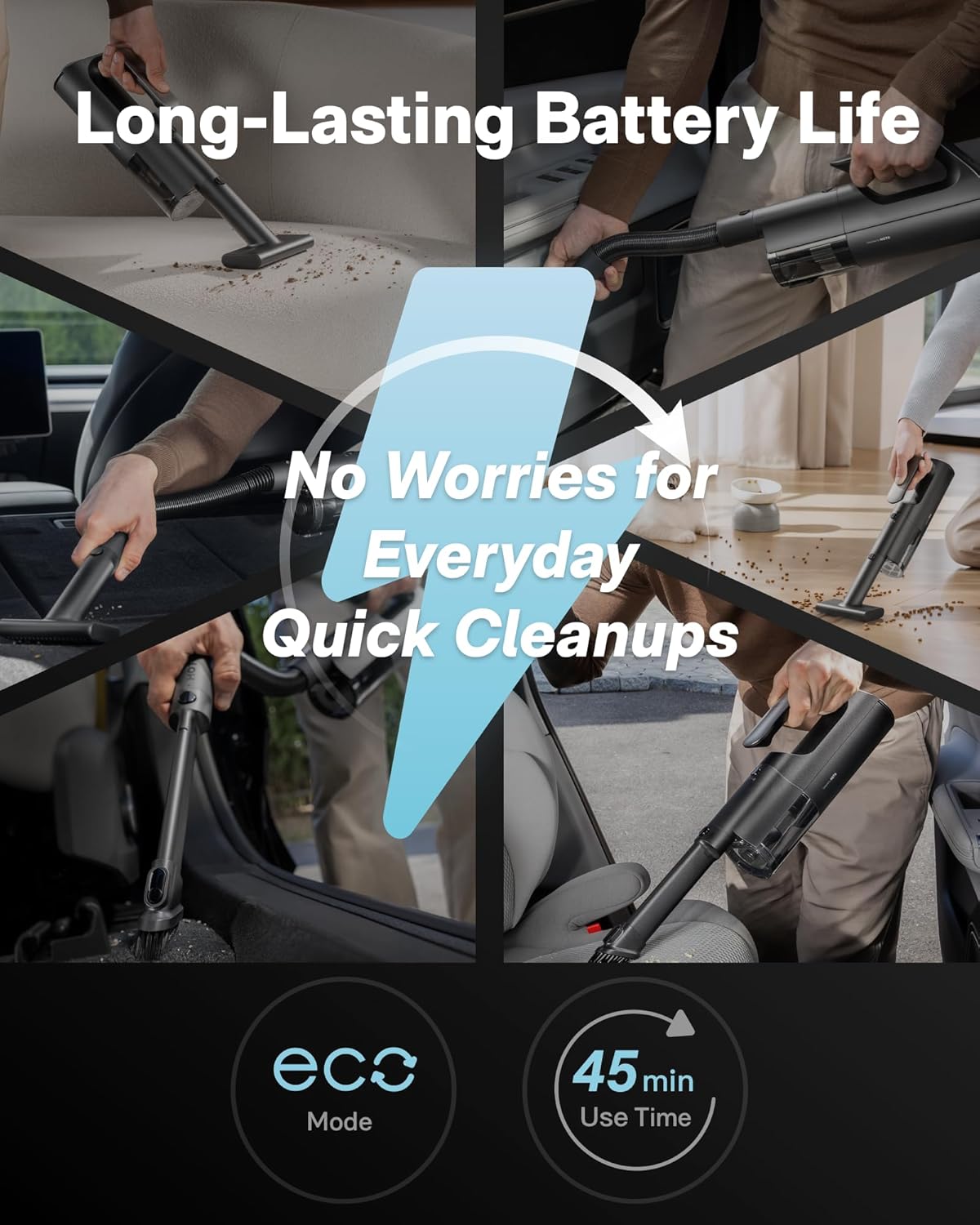 Right Power for Every Mess: From quick touch-ups to longer cleanups, this handheld vacuum features 3 suction levels for precise power control. Boost (23,000Pa) tackles stubborn debris (10 min), Standard (15,000Pa) handles daily cleanup (20 min), and Eco (8,000Pa) is ideal for light tasks (45 min). You use only the power you need, helping extend runtime and reduce recharging frequency