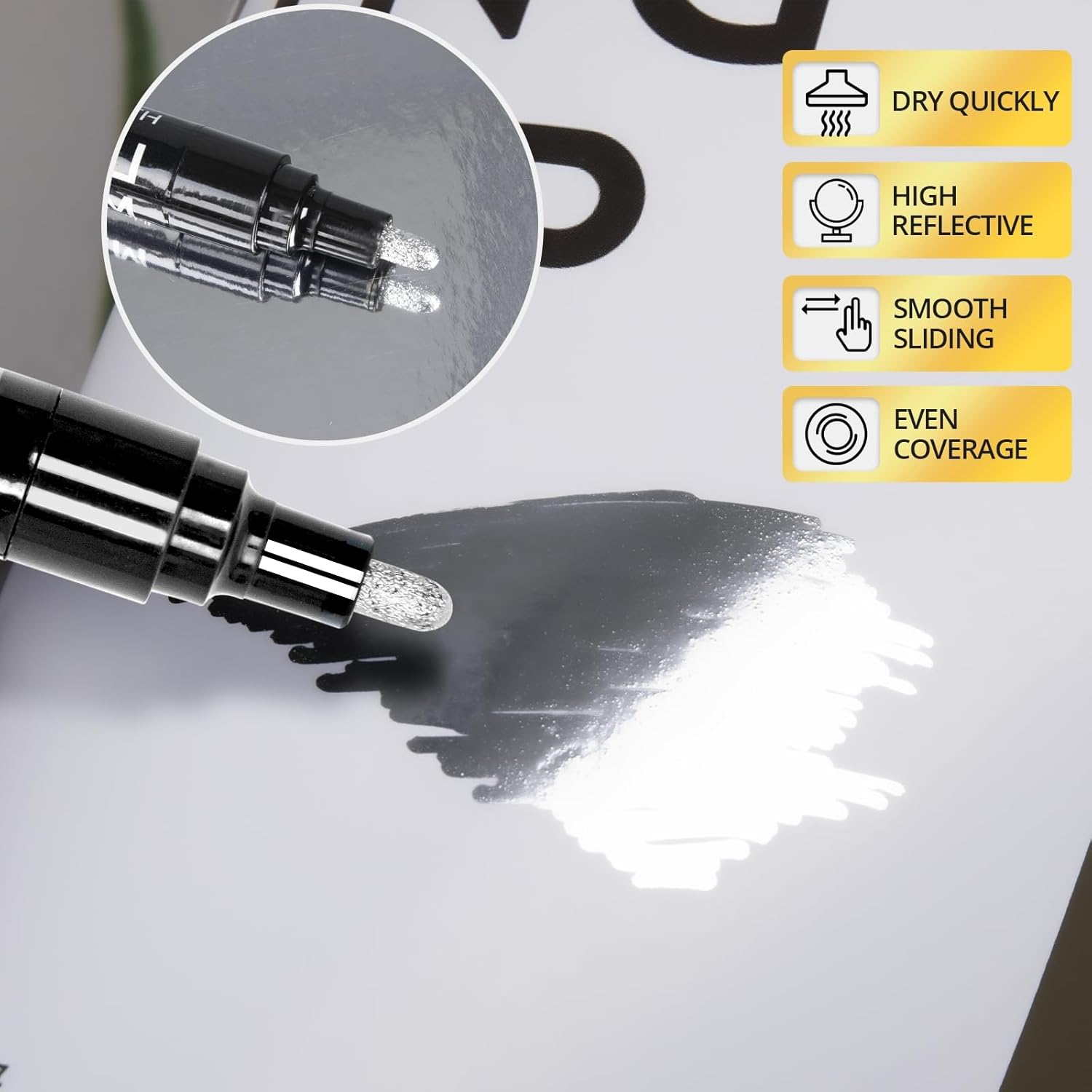 Shiny Finish but Tricky ApplicationI tried out this set of silver chrome paint pens on a few small projects—some toy detailing and accent lines on a craft piece—and the first thing I noticed is how striking the finish looks when it comes out right. The ink is bold, reflective, and really does give a metallic chrome effect that pops against darker surfaces. Having three different nib sizes in the set is handy too, since I could switch between fine detail and filling in slightly larger areas without needing a second product.That said, the performance isn’t always consistent. The pens take a little patience to prime, and sometimes the ink flow is either too heavy (leading to smudges or pooling) or a bit streaky. On slick or non-porous surfaces, I found that the ink smears easily if touched before it’s fully cured, which can take longer than expected. Durability is also something to keep in mind—it looks great initially but doesn’t always hold up to handling or rubbing, so for anything that gets a lot of use, a clear sealant might be necessary.Bottom line: These chrome paint pens can produce a beautiful, mirror-like effect, but they require careful application and aren’t the most durable on their own. Best for craft projects or display items where looks matter more than wear resistance.