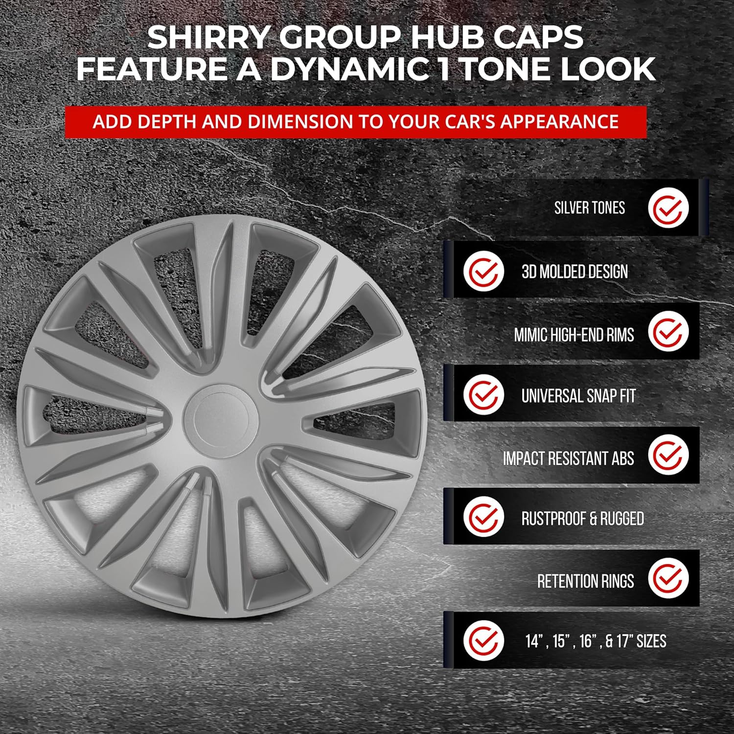 ESSENTIAL CAR-ACCESSORIES for your family car or ride-share sedan, Shirry Group Hub Caps elevate any vehicle. Give a set to your teen for their first car or give a used car more curb appeal for resale.
