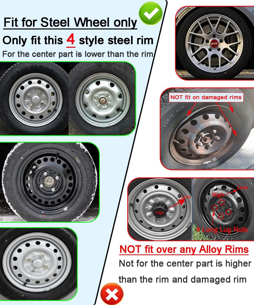 Steel Wheels Universal Fit – Design for 16″ Steel(Non-alloy) Wheels only,NOT compatible with alloy rims,NOT for wheel hub center is raised above the rim level,NOT for damaged/deformed steel rims, NOT for Steel Rims with Long Lug Nuts. Compatible with Toyota, Honda, Ford, Hyundai, Kia, Mazda, Mitsubishi, Nissan, Subaru, Acura, Volkswagen, Dodge, etc.