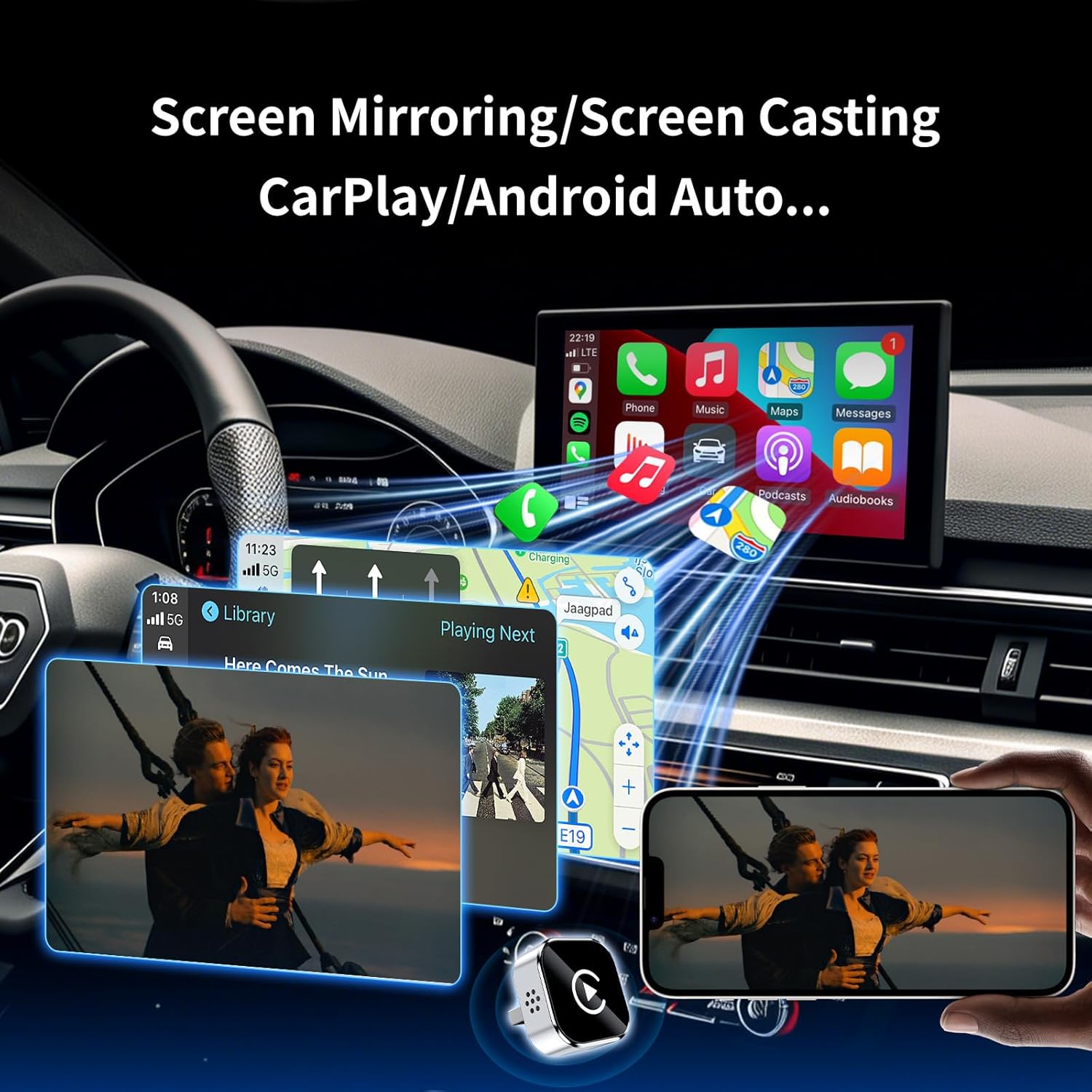 🔥 Cinema-grade streaming (ultra-smooth at 90ms latency): Wireless screen mirroring with CarPlay for ultra-low latency video streaming. Enjoy TV shows or movies through your car’s audio system with zero loss in playback quality for TikTok/YouTube. 4K resolution. Compatible with Apple and Android phones. Please note: Screen mirroring of copyrighted films is not permitted.