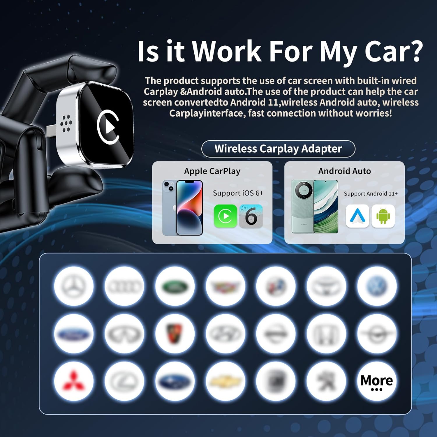 Super impressed with this adapter! Setup was quick and it works flawlessly in my car. The best part is that it supports both AirPlay and CarPlay, which gives a lot more flexibility than most adapters. It essentially converts your regular CarPlay screen into a smart display where you can watch movies or YouTube videos, which is a huge bonus. The connection has been stable with no noticeable lag, and everything runs smoothly. Definitely a great upgrade if you want to go fully wireless.