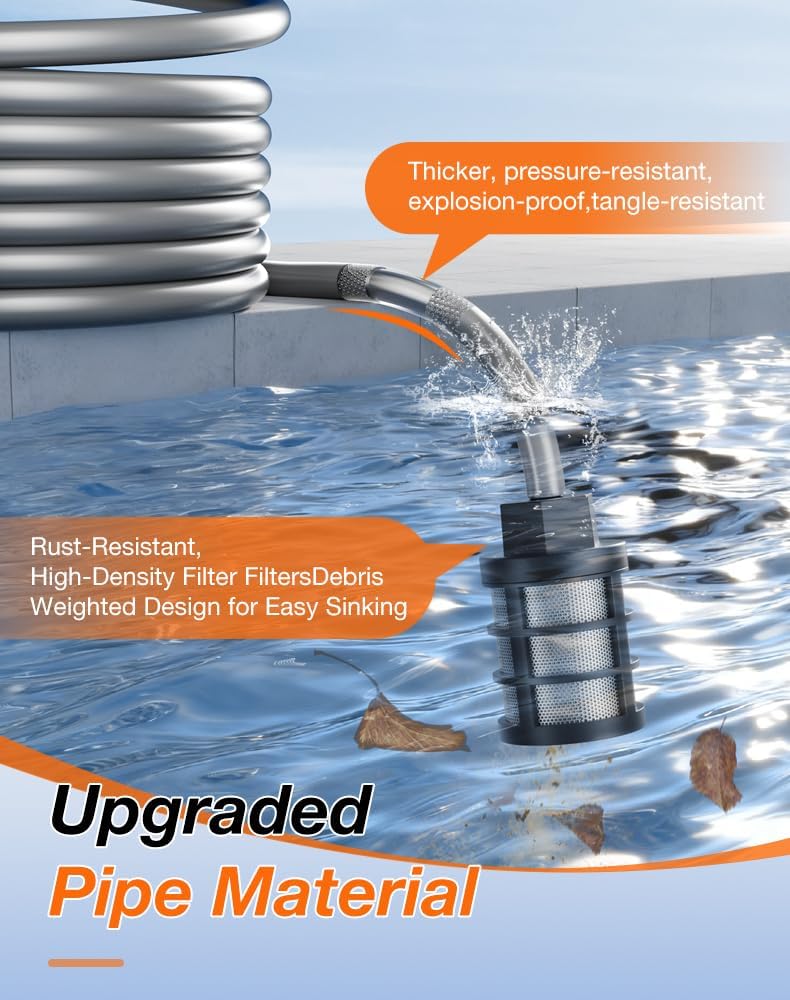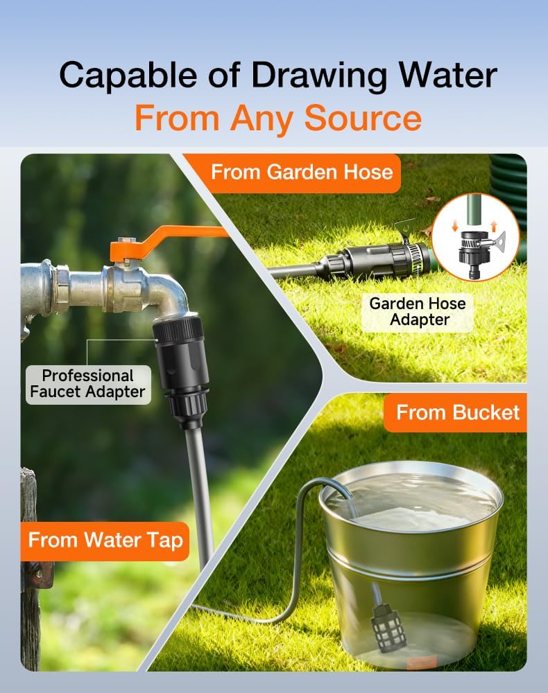 Universal Water Source & Premium 20ft Hose:Connect easily to faucets, buckets, or pools with our leak-proof universal adapter. The 20ft extra-strength hose is kink-resistant, crush-proof, and comes with a metal filter for clean water intake. This cordless pressure washer makes water access convenient anywhere—indoors or outdoors.