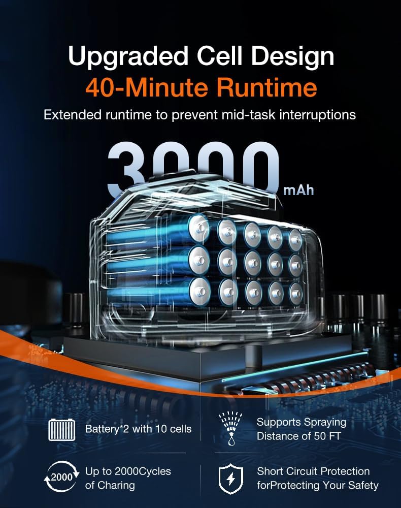 Long-Lasting Battery & Extended Runtime:Powered by a 10-cell rechargeable battery, this cordless power washer runs up to 40 minutes on a single charge. With 2000+ life cycles, 50 ft spray range, and short-circuit protection, it delivers reliable, long-term cleaning power for your home and outdoor tasks.