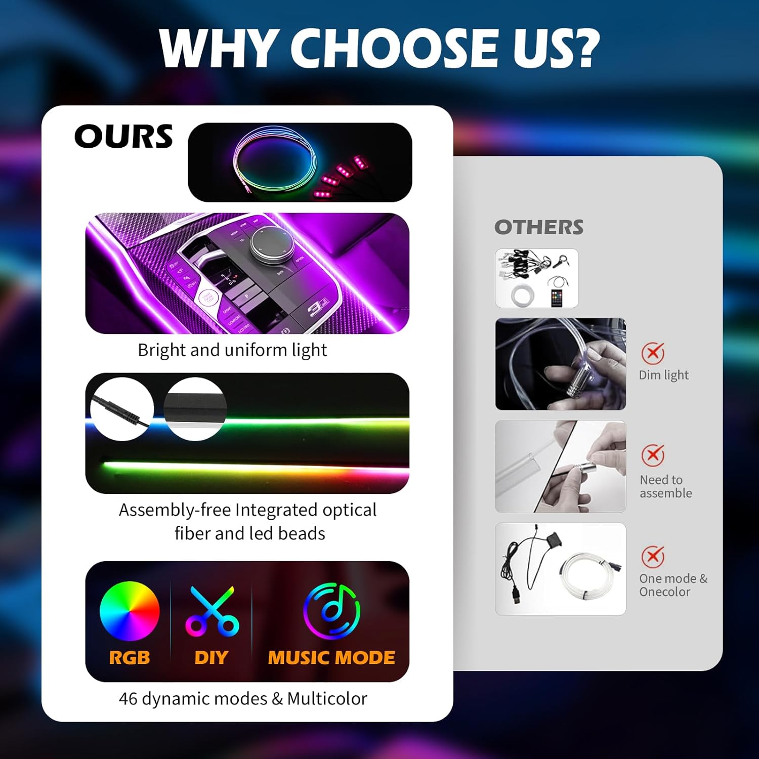 【High Brightness】The Dream Color acrylic light strip have super bright LED and acrylic lens and contains 10 LED strips, the light strip is equipped with hundreds of bright LEDs to ensure bright, soft, and uniform lighting. Whether it’s day or night, make your car stand out!can be flexibly installed on any car by DIY without disorganized, which is plug and play, easy to use it and more uniform and softer than other optical fiber lamps that rely on only one LED.