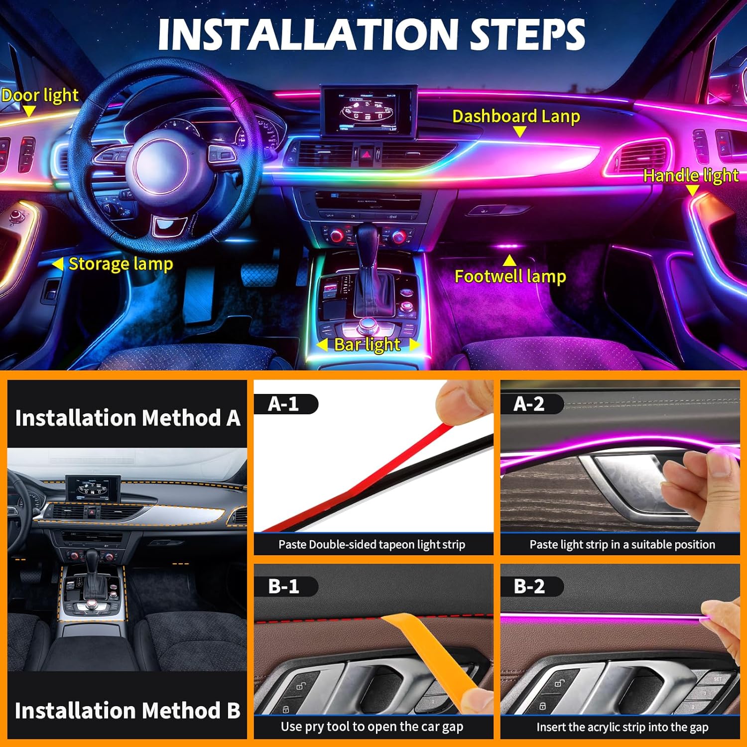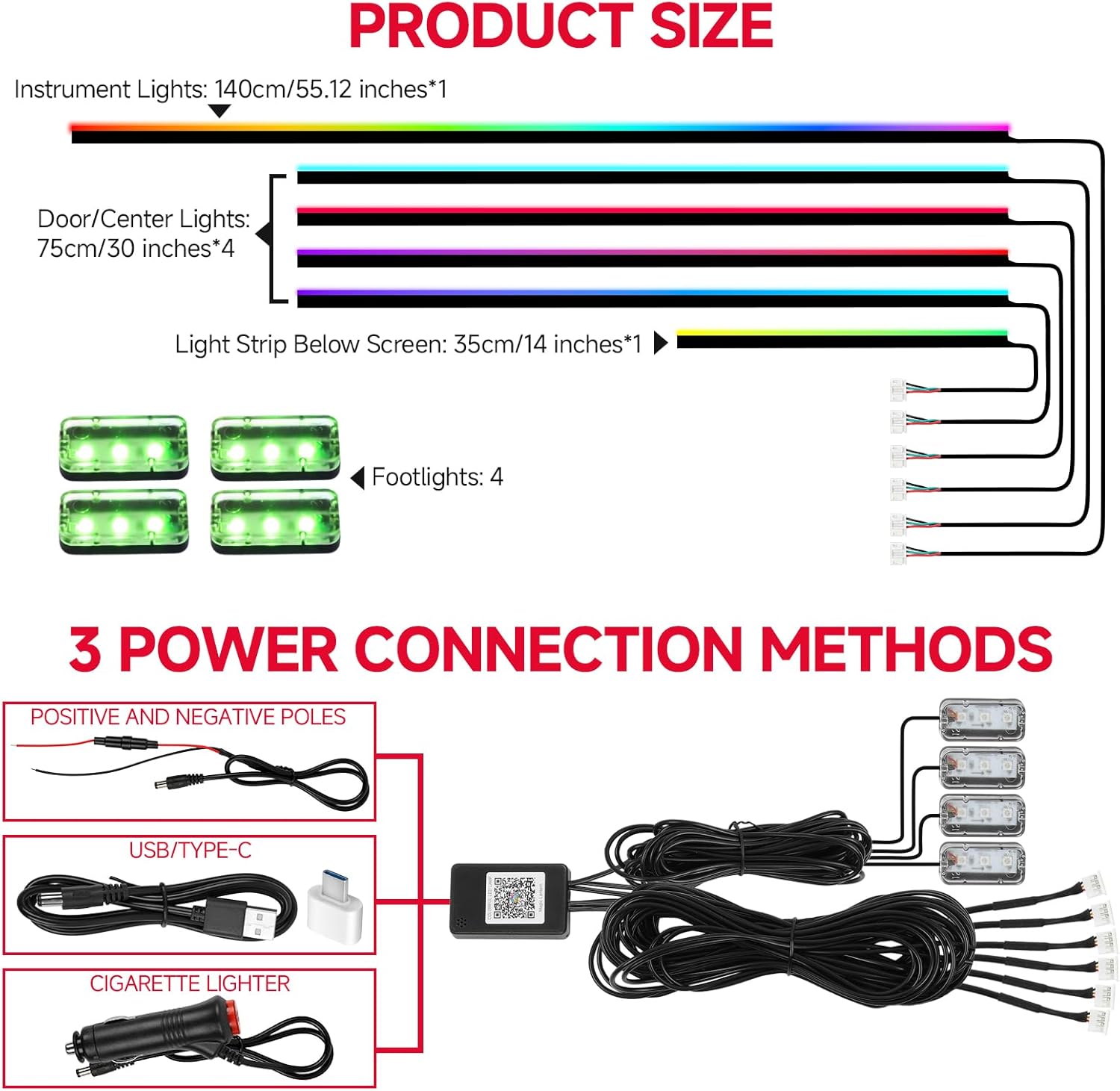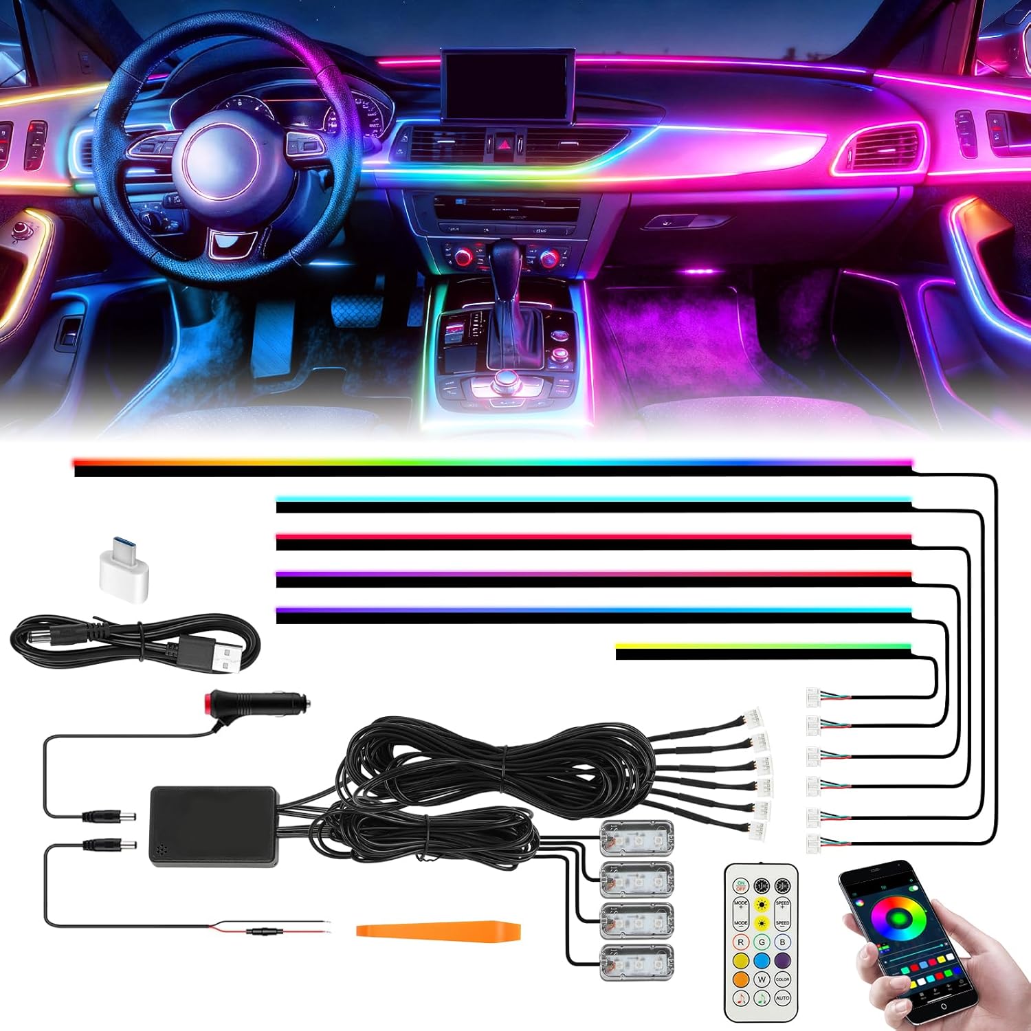 【Dual Control】The car LED light is dual controlled by smart app and remote controller,16 million colors and 213 flexible color modes for you to DIY a static color for lighting and modes combination by your phone.Built-in various modes, APP control to turn lights on or off,dim or brighten,change colors,modes,DIY, timing and even adjust the speed of dynamic mode,personalize your car.