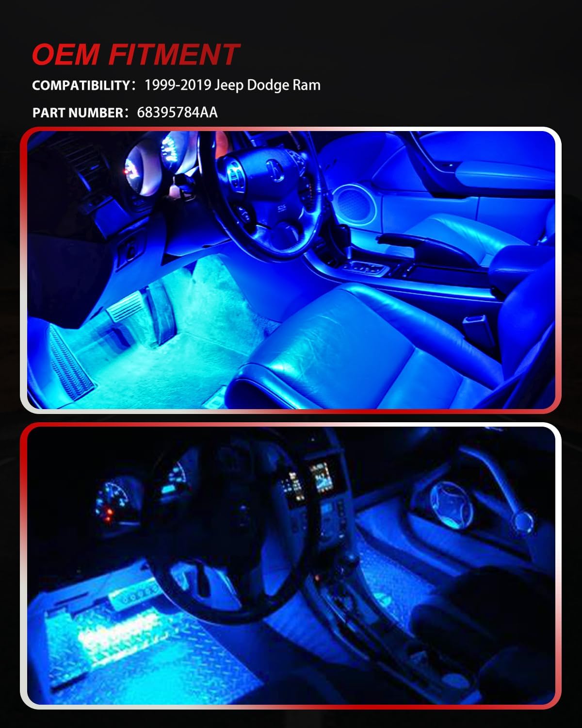 FITMENT:This auction features 2PCS 3x Brighter Ice Blue LED Interior Courtesy Footwell Lights Assembly Compatible With 1999-2010 Jeep Wrangler, 1999-2021 Jeep Grand Cherokee, 2006-2010 Jeep Commander, 2002-2012 Jeep Liberty, 2013-2022 Dodge Ram 1500, 2019-2022 Dodge Ram 1500 Classic, 2013-2022 Dodge Ram 2500, 2012-2022 Dodge Ram 3500, 2011-2021 Dodge Durango & 2007-2011 Dodge Nitro.