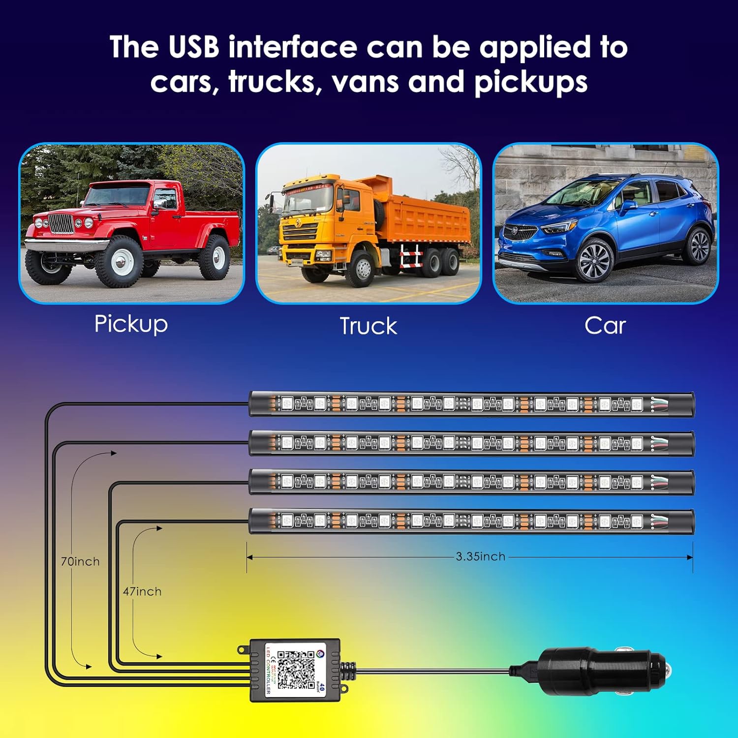 Four-Line design led lights for car interior, easier to hide and keep your car clean and tidy, not only suitable for car decoration, but also tv bias lighting, home, KTV, party decortaion with USB port.