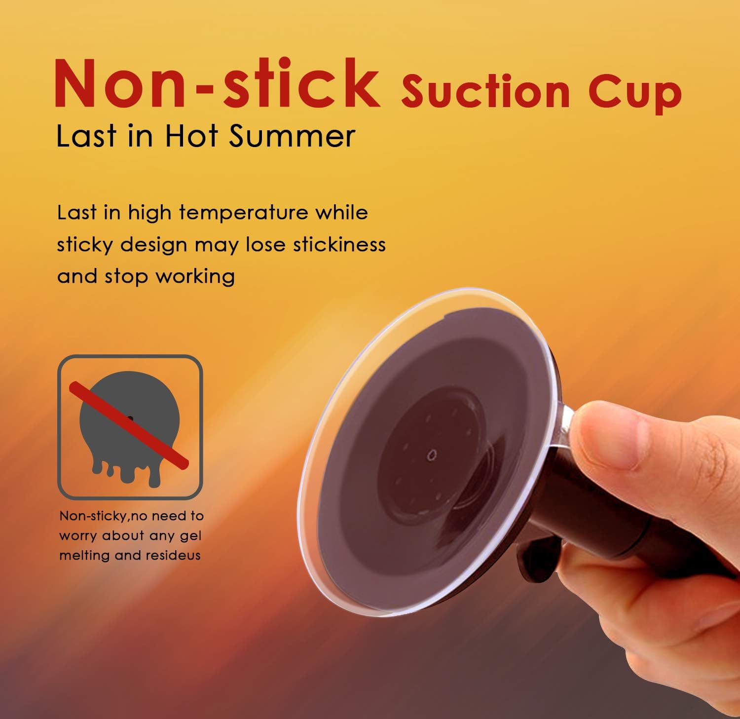 No Glue Suction Cup Windshield Holder, Can Last in Hot Summer. Note: It can’t be used to car dashboard. The non-sticky suction cup can stick to windshield/glass sturdily as sticky one does. What’s more, it will work in hot weather, because its suction will last in high temperature while the sticky suction cup may lost stickiness and stop working.