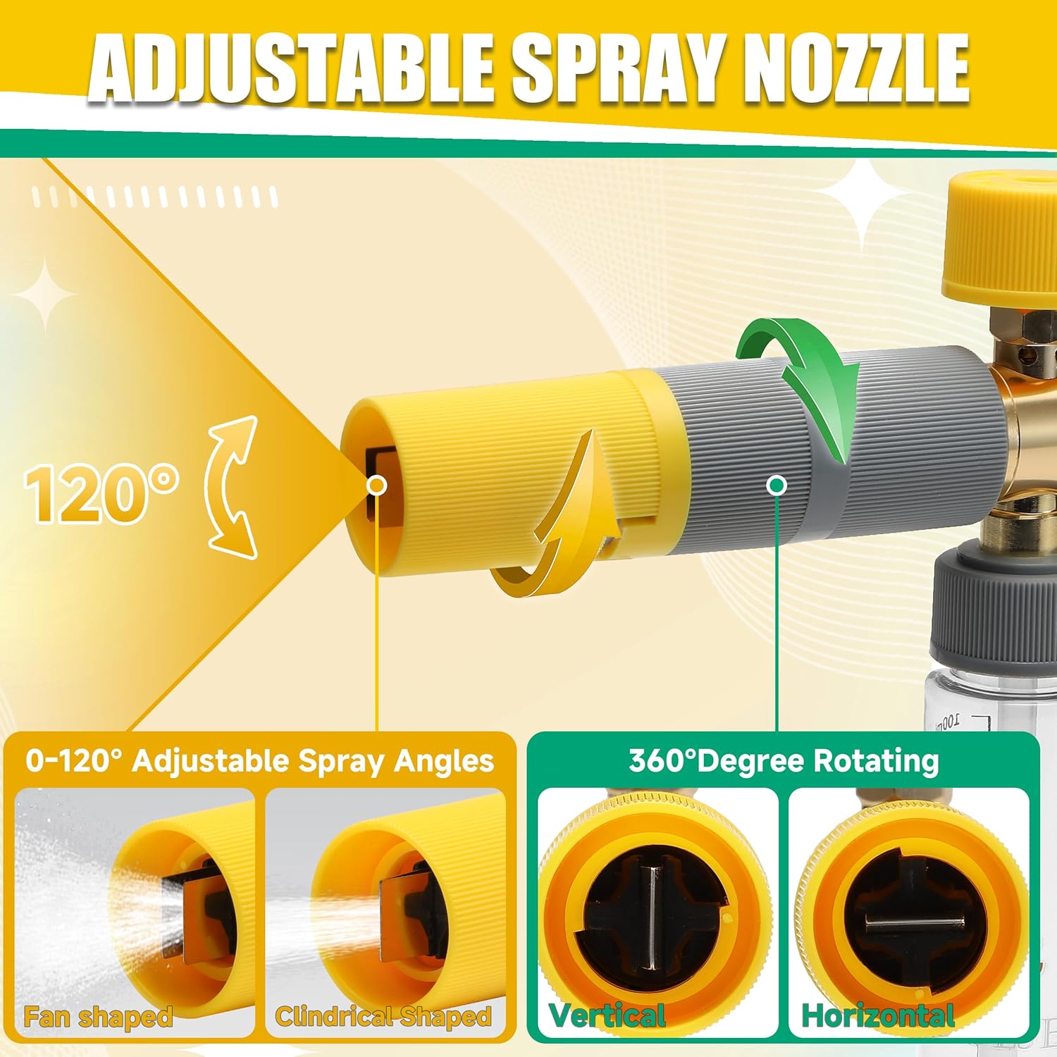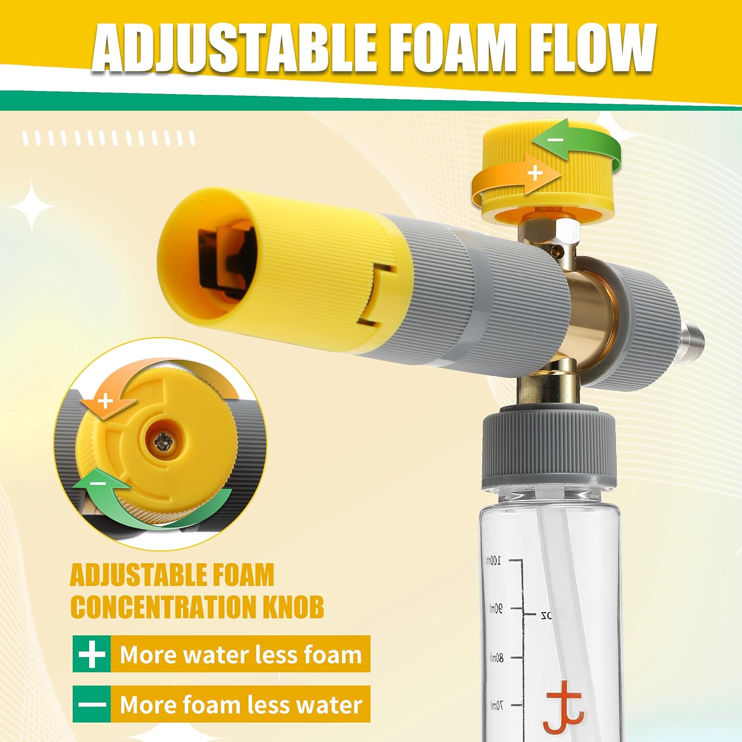 Adjustable Foam Jet: Customize your spray with a pressure washer adjustable nozzle that lets you switch from a focused stream to a wide fan. The top-mounted knob also lets you control the water-to-foam ratio for the perfect mix every time.