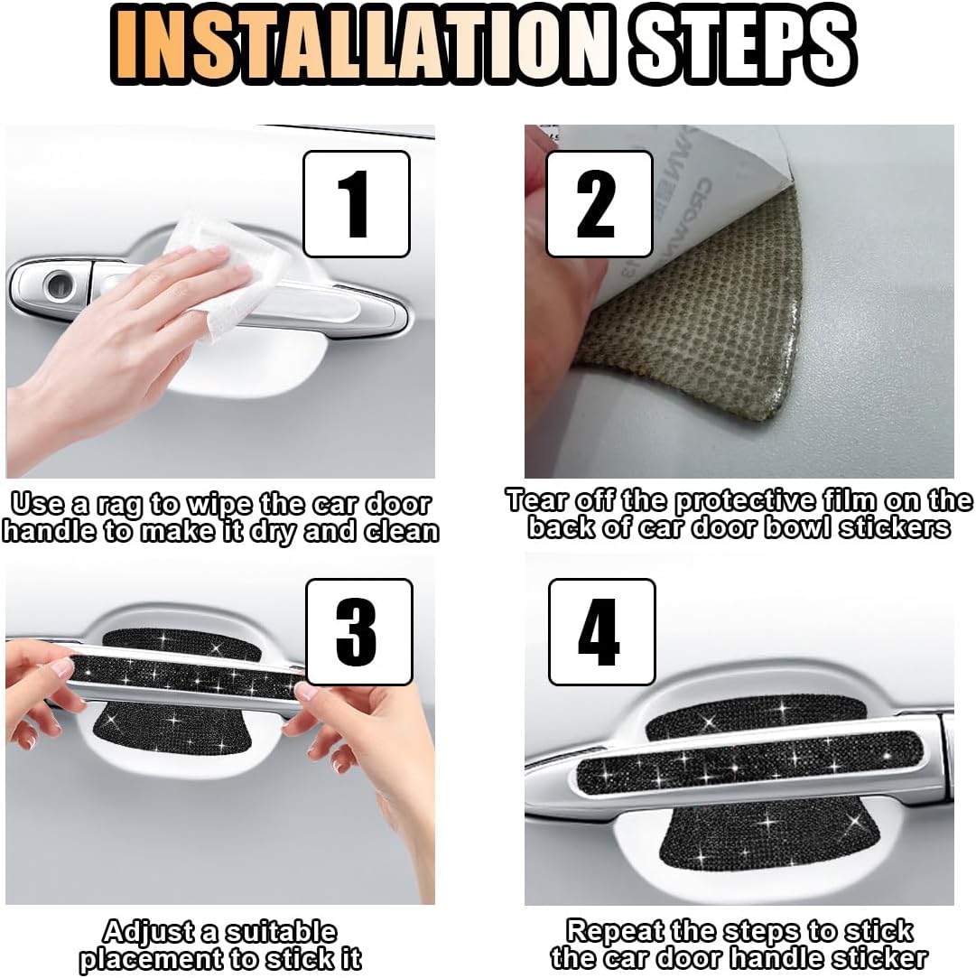 【High-Quality Materials】:The door protector is made of high-quality rhinestones and hot-melt adhesive. The hot-melt adhesive has the characteristics of high strength, oxidation resistance, and strong adhesion. It can be well attached to the car body and protect the door handle very well.