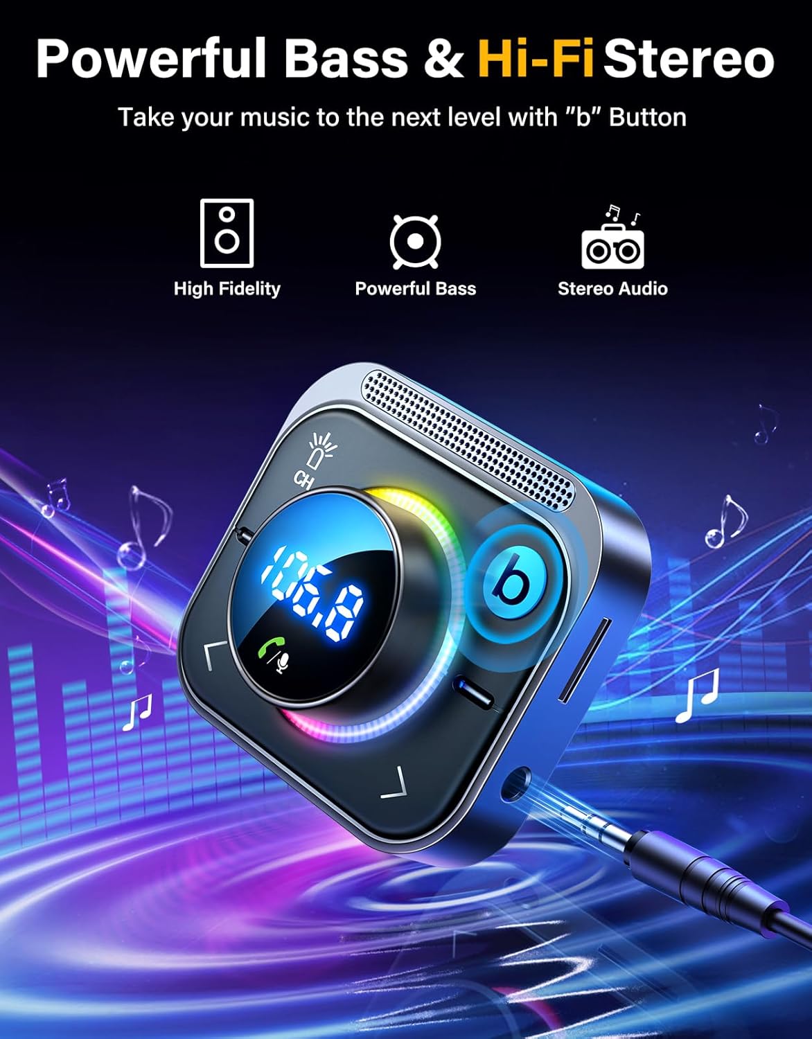 🎵【Hi-fi Bass Boost】 After self-optimizing the sound, this bluetooth transmitter car will transmit high-fidelity, well-balanced audio from your device to the car system. Just press the button “b” to Immerse yourself in powerful deep bass and stereo sound.A bass-heavy audio performance makes it ideal for drving, because it’s powerful enough to cut through wind noise.