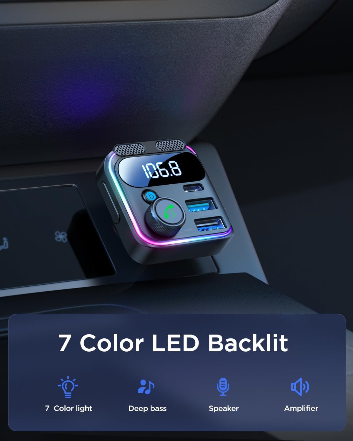 [7-Color LED Light Bar] – Voltage Detection & Safe Night Drive. Locate this Bluetooth adapter for car quickly at night with its 7-color LED light bar (the light can be turned off to avoid distraction). Built-in LED voltage indicator automatically detects car battery voltage when starting the car, alerting you to potential electrical issues in advance. With user-friendly design and Bluetooth auto-connect function, this car Bluetooth transmitter is easy to operate while driving