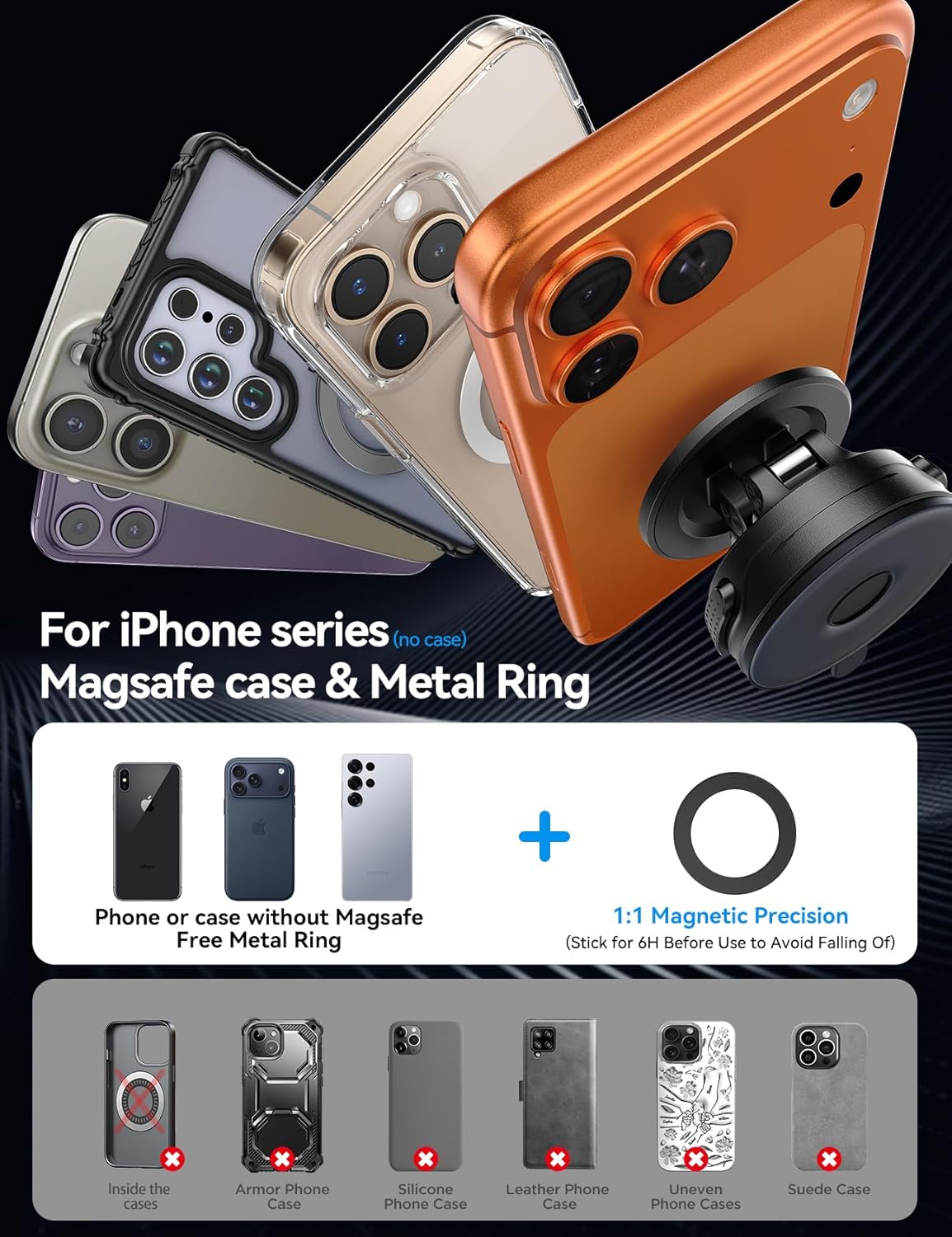 Can be used with MagSafe and non-MagSafe phones, even on surfaces that aren’t perfectly smooth