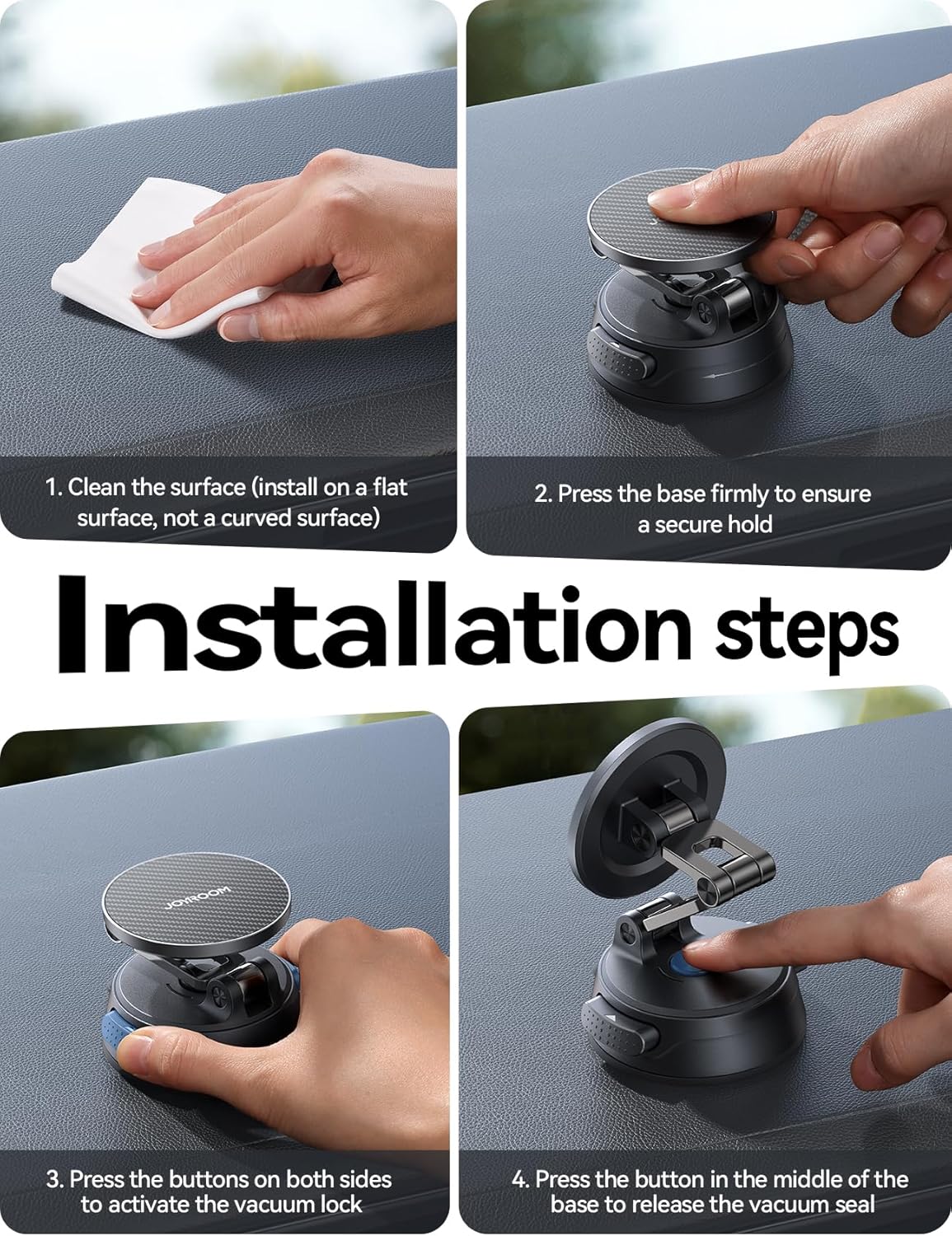 【Rock-solid Car Mount for iPhone】Experience an unshakable hold with our advanced vacuum-lock system. A firm press on the side buttons actively expels air, creating a powerful vacuum seal against your dashboard or windshield. This vacuum state, enhanced by the conforming gel-pad base, ensures the mount adheres with incredible force. Release is just as intuitive—a simple press of the central button breaks the seal instantly.