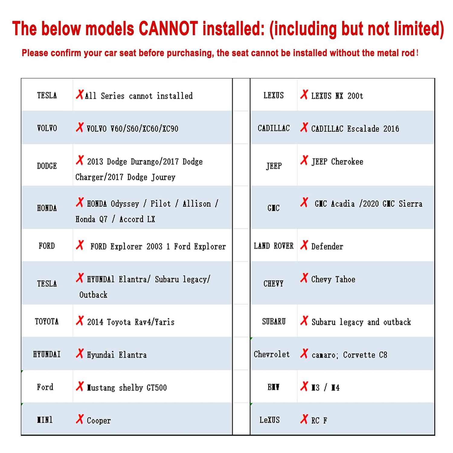 NOT COMPATIBLE: 2020 GMC Serria Truck third row seats, tesla seats, 2014 Toyota Rav4, 2017 suv, Volvo XC60 2013 model, Hyundai Elantra, Subaru legacy and outback, Cadillac Escalade 2016, 2004 mdx, Odyssey 2018 seats, Honda minivan, Honda minivan, middle seat of dodge durango, minivan sea, Chevy surburban, Tahoe seats, jeep grand, cherokee 2nd row bucket seat, 2017 Dodge Journey, Ford Explorer 2003, GMC Acadia, Cherokee , ford explorer, vovo s90, 2018 Honda Odyssey, Jeep Wrangler seats
