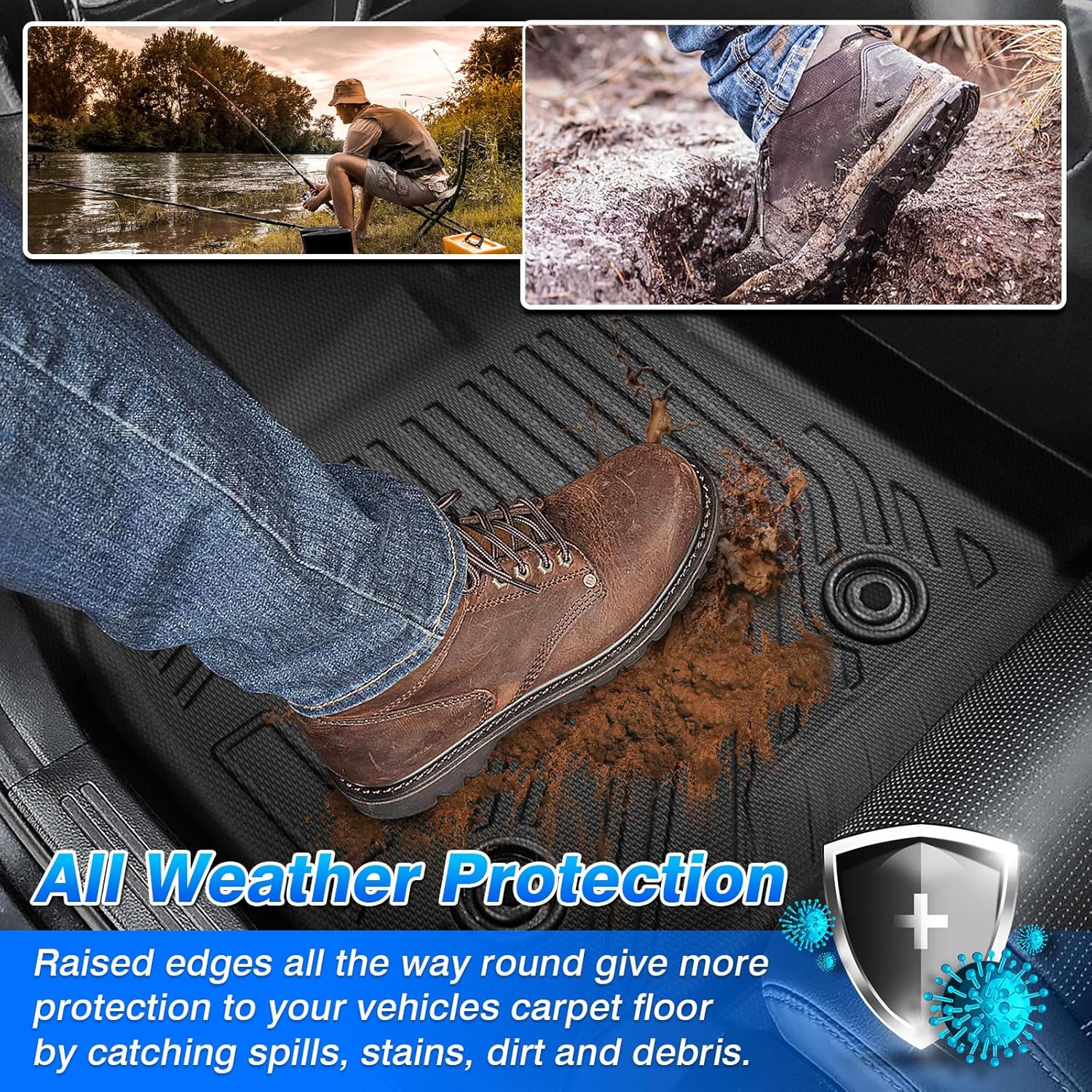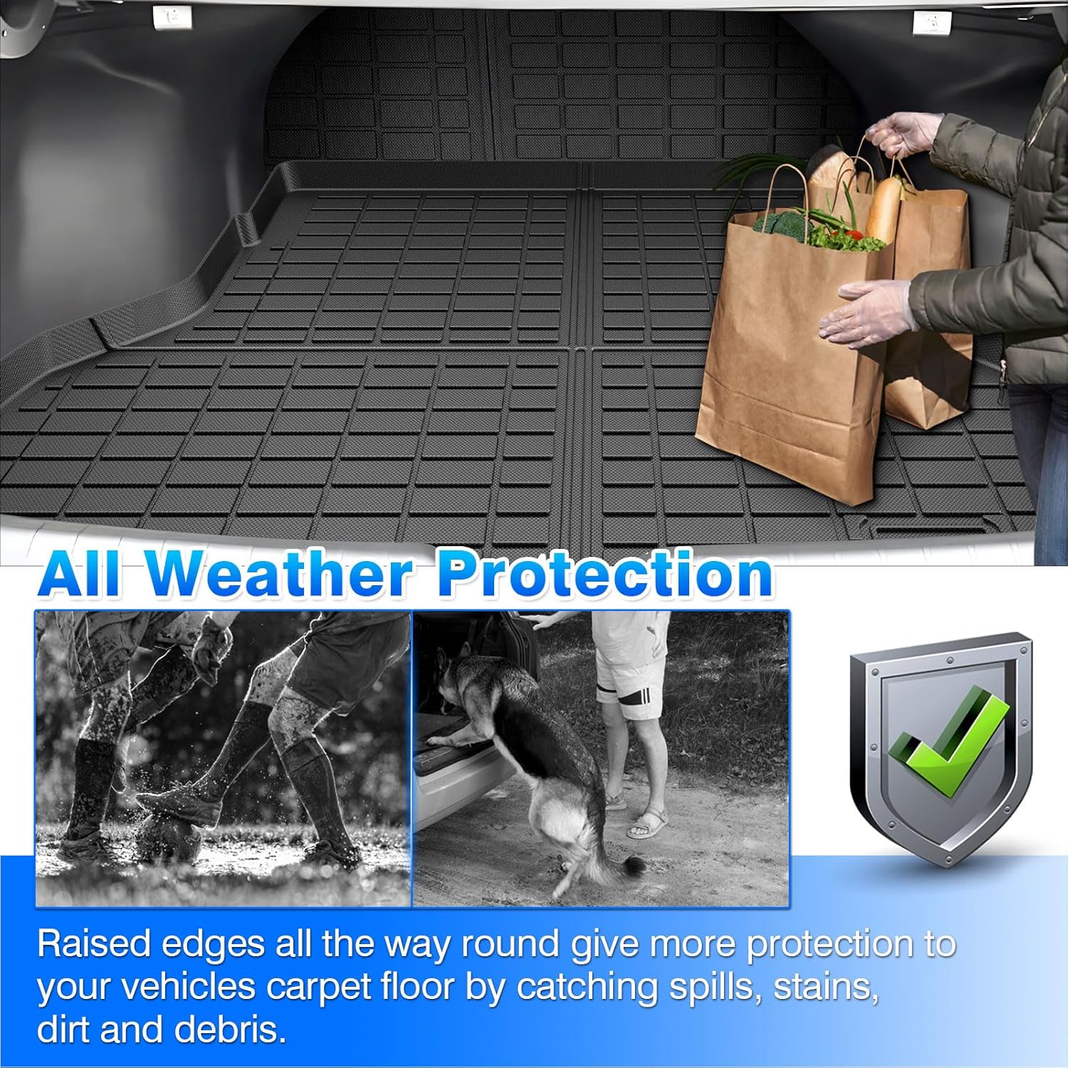All Weather Protect & Cleaning — The grooves on the floor mats and cargo liner help to block water, mud, snow, debris, ect, to avoid accidental skidding and stains to original car carpets. 100% waterproof of TPE material. Easy to clean by rinsing it with water, and dry with towel.